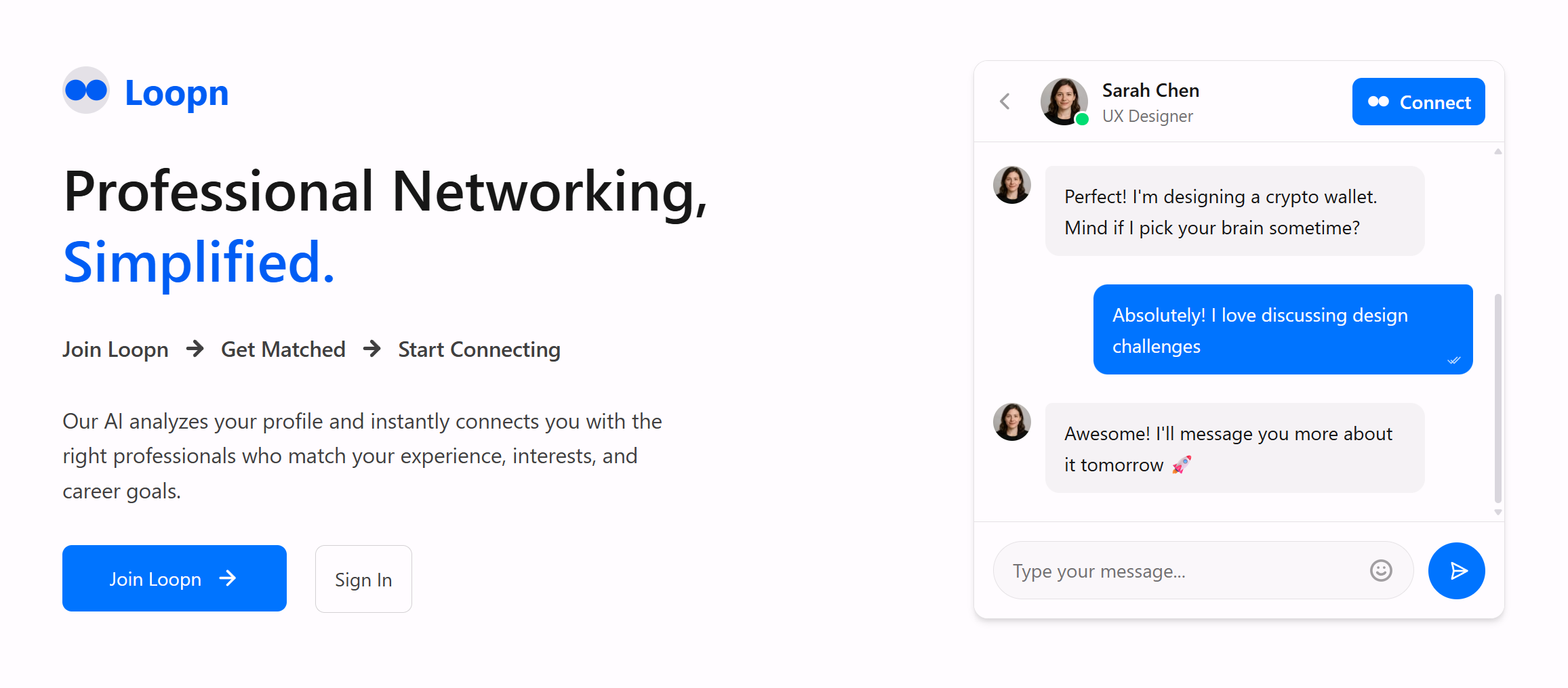 Loopn是一款专业网络应用,通过AI引擎推荐用户进行真实交流,专注于实时聊天,旨在帮助用户建立有效的职业联系。