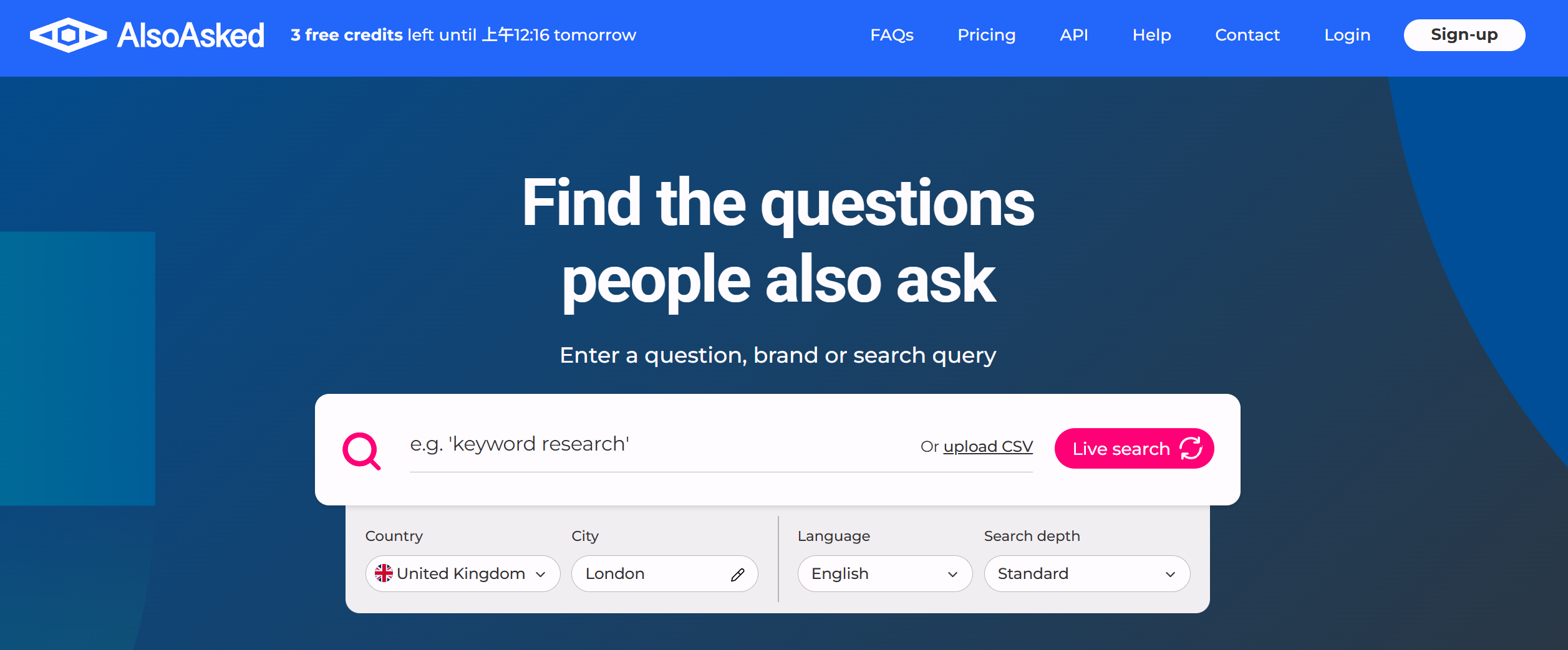 AlsoAsked是一款专注于挖掘用户搜索行为的工具,帮助内容创作者和营销人员深入了解用户的搜索意图。
