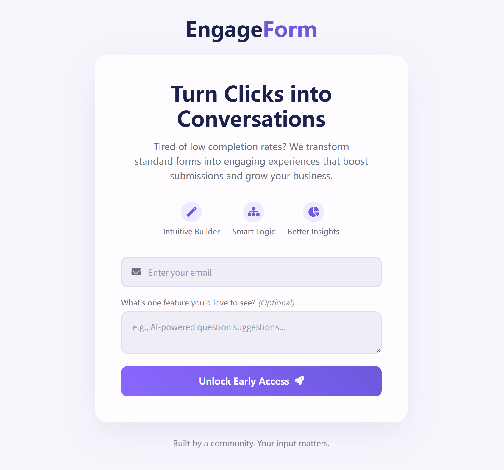 EngageForm是一款表单构建器软件,开发者希望通过用户反馈来解决现有表单工具的痛点,提升用户体验。