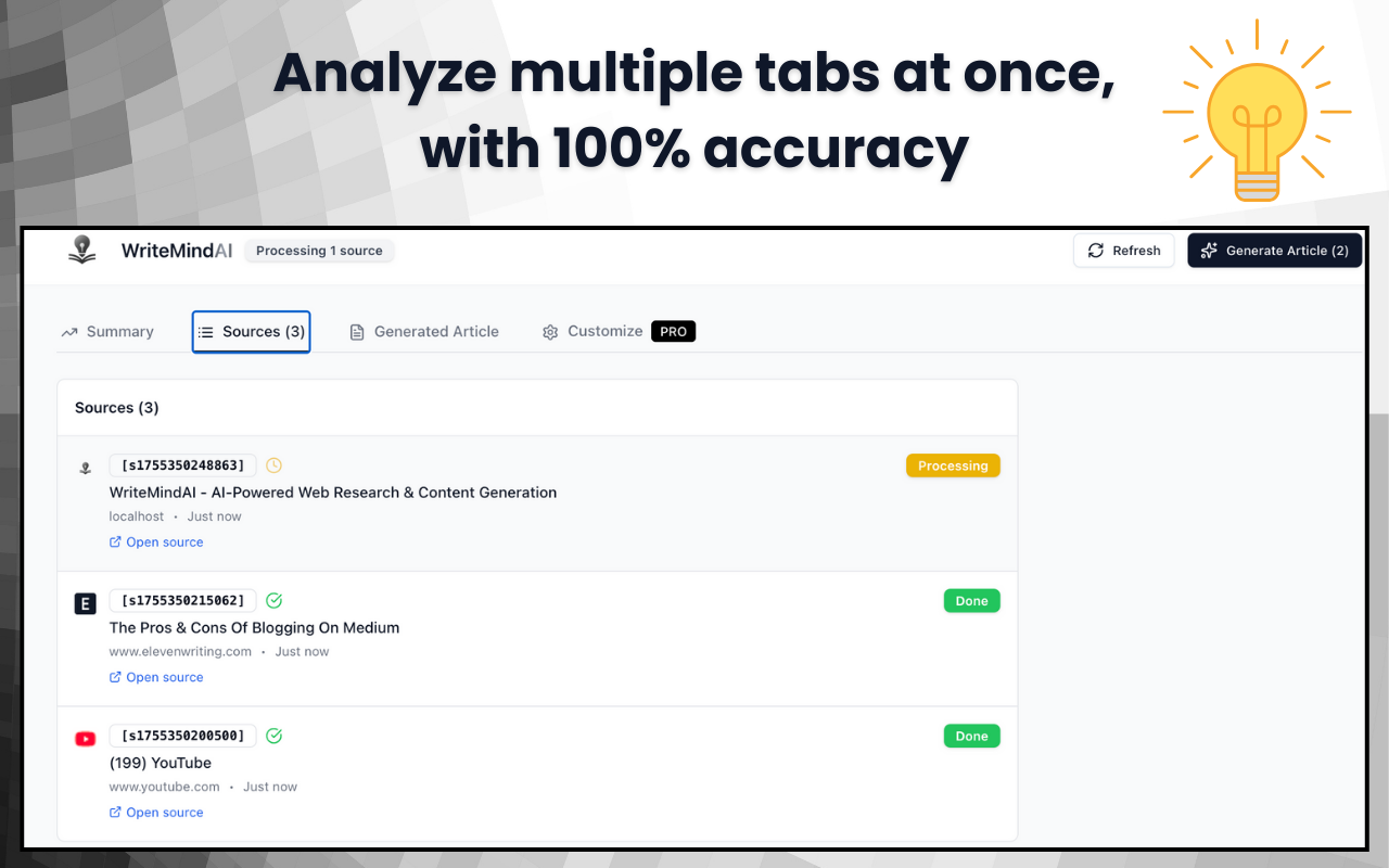 WriteMindAI是一款Chrome扩展,能够将10个以上的研究标签快速转换为结构化、引用准备好的草稿,支持导出为Markdown格式。
