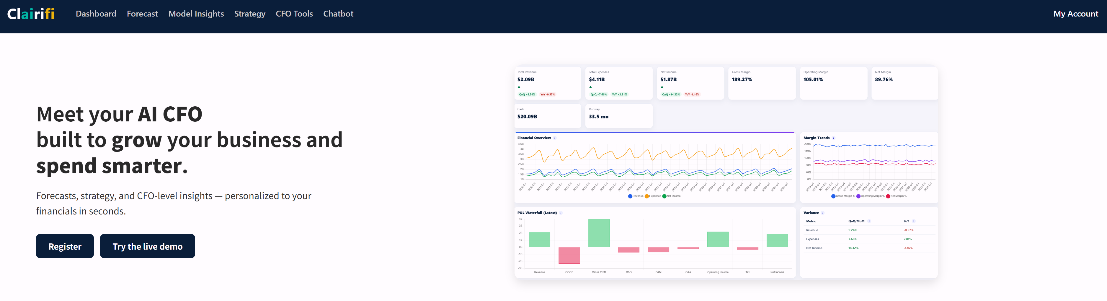 Clairifi是一款帮助创始人管理资金的应用,提供战略洞察、财务预测、模型分析、CFO工具、聊天机器人和仪表盘等功能,旨在节省开支和优化财务状况。
