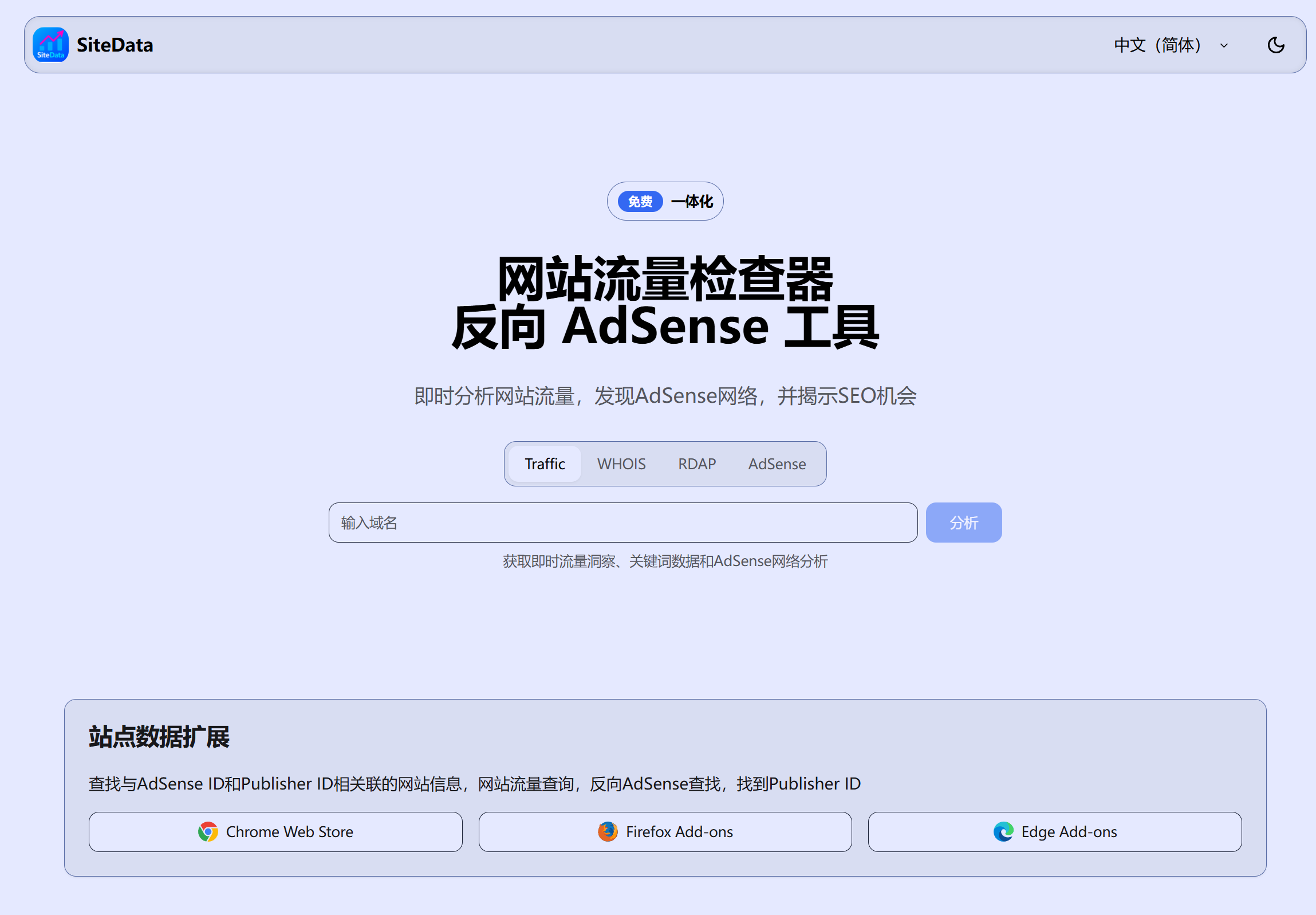 SiteData是一款免费的网站流量查询分析浏览器插件,隐私友好,能够快速查询网站流量趋势、关键词分布及流量来源,并通过Google AdSense Publisher ID反查关联网站,所有数据保存在本地设备。
