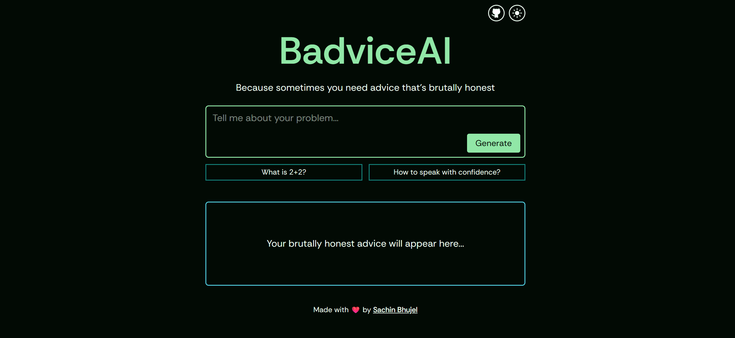 Badvice AI是一款幽默的AI应用,针对任何问题提供搞笑的坏建议,适合用来调侃朋友或做出不应遵循的决策。