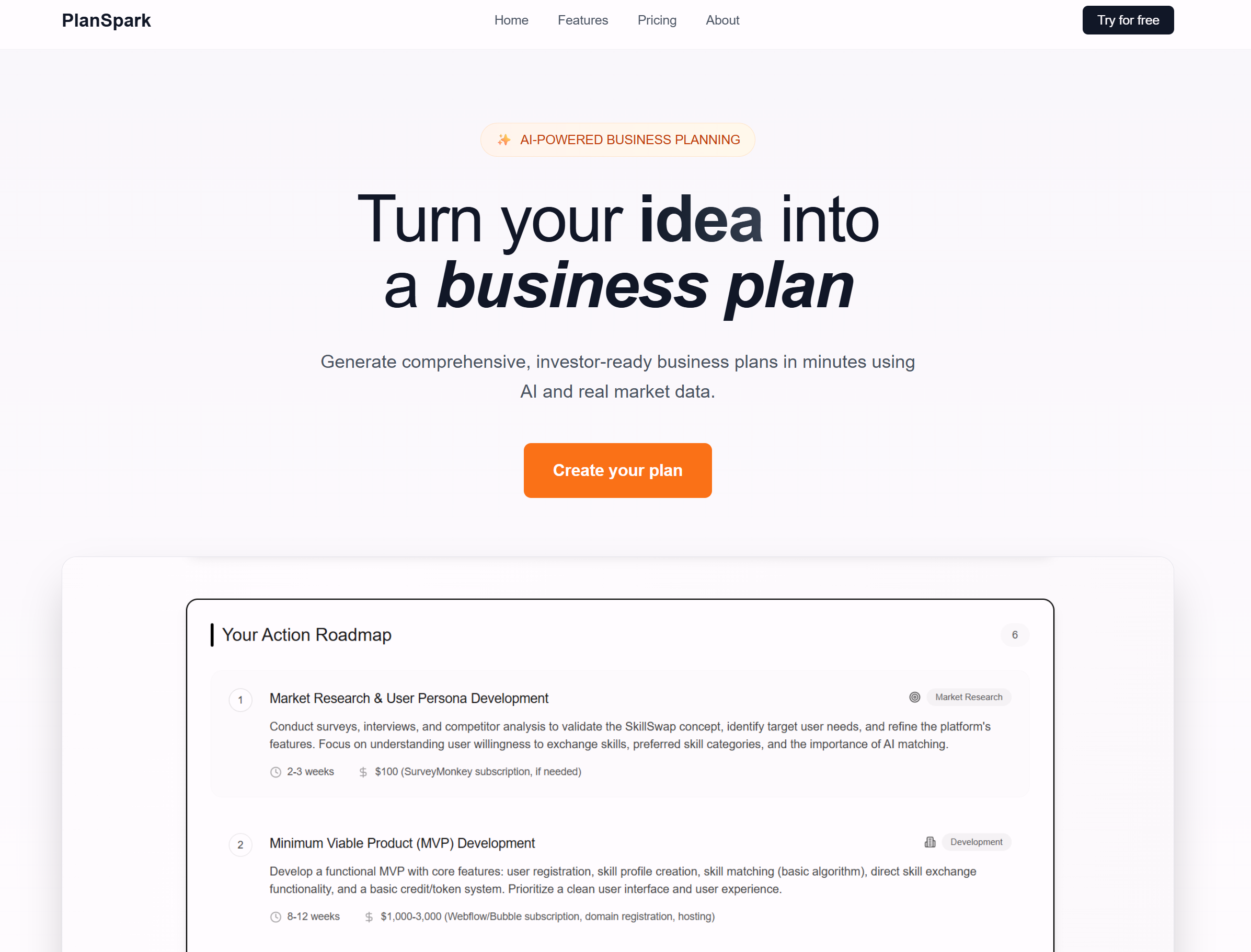 PlanSpark是一款AI驱动的商业计划生成器,帮助用户快速创建商业计划,无需复杂的提示或Excel模板。