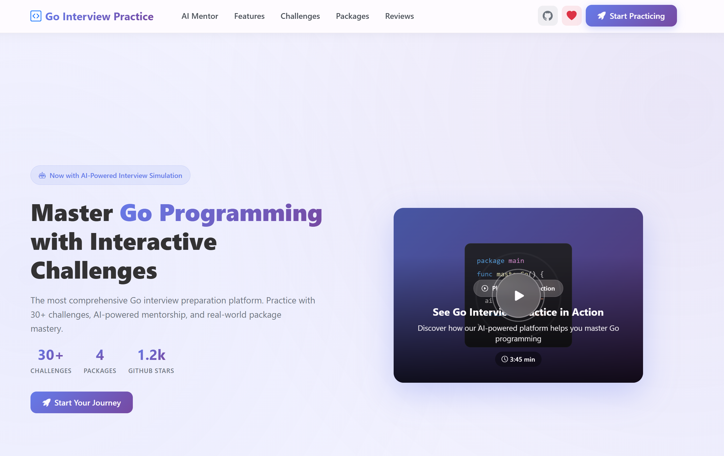 GoInterview是一款互动式Go语言学习平台,提供30+编程挑战、实时反馈、AI面试模拟、竞争排行榜和自动化测试,适合从初级到高级的学习者。