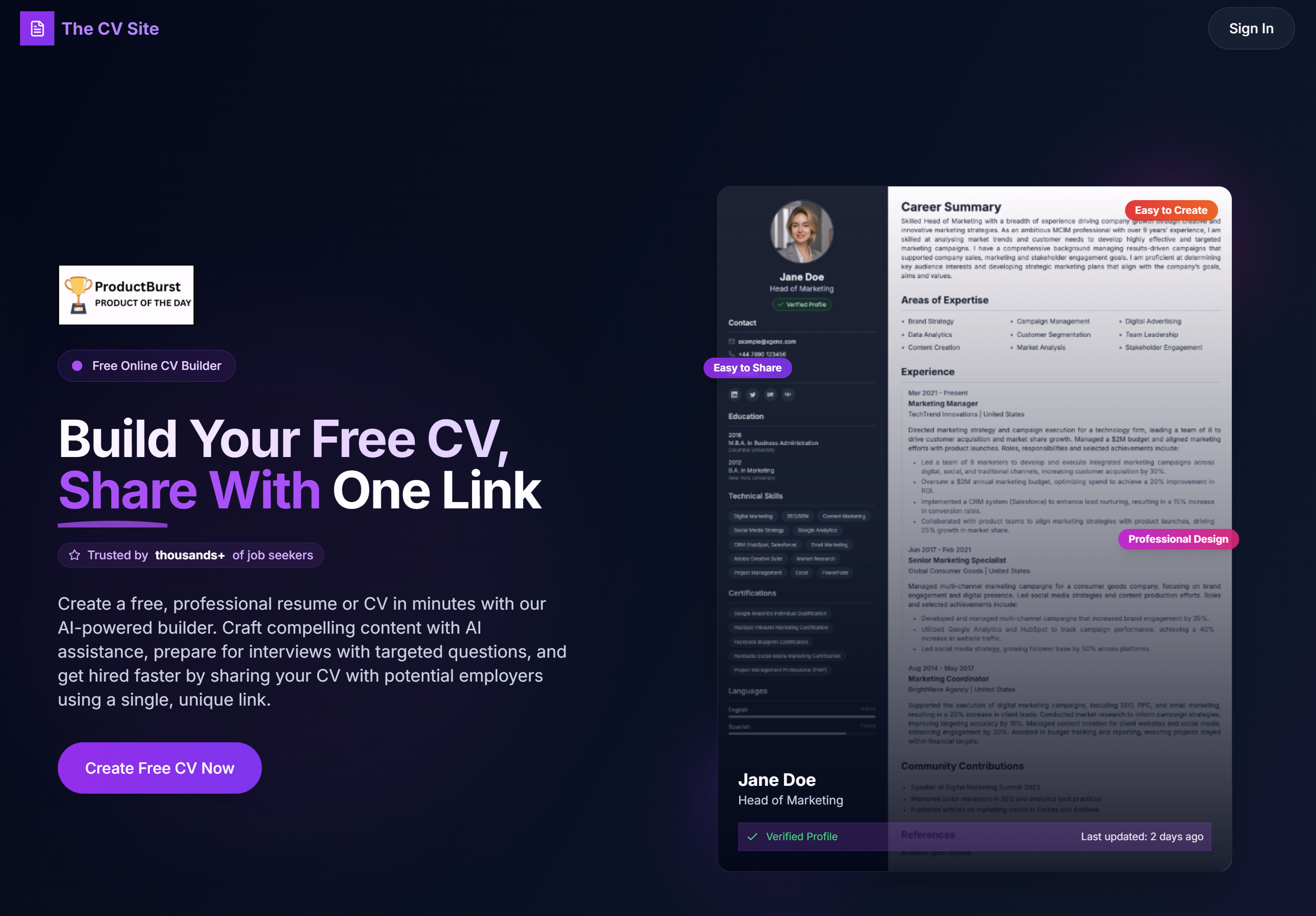 The CV Site是一款专业简历和面试准备应用,帮助用户创建和托管简历,并通过简单链接在线分享。