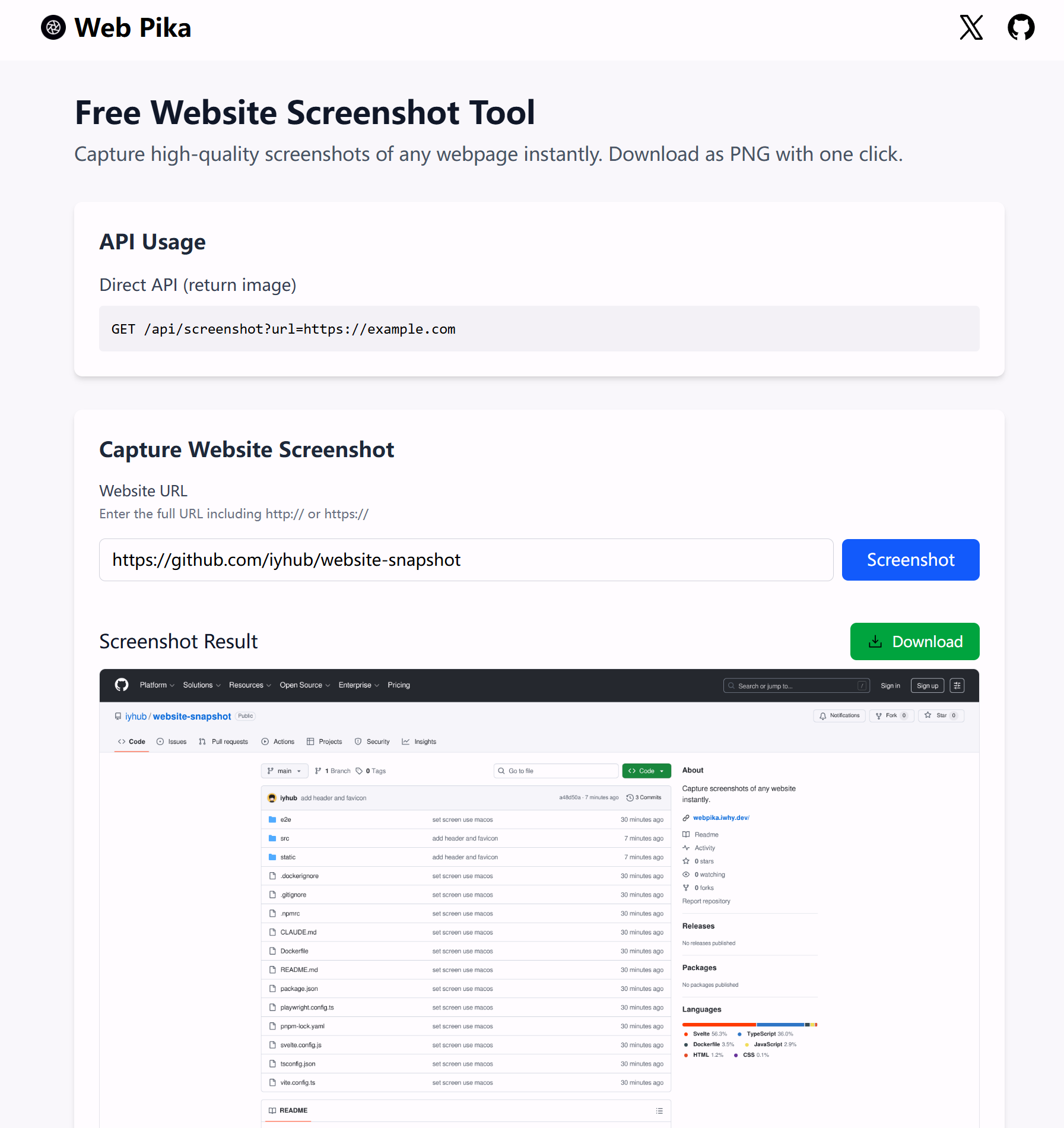 WebPika是一款网页截图工具,通过输入URL获取网页截图,并支持API调用,适用于导航站产品截图和日常网页截图等场景。