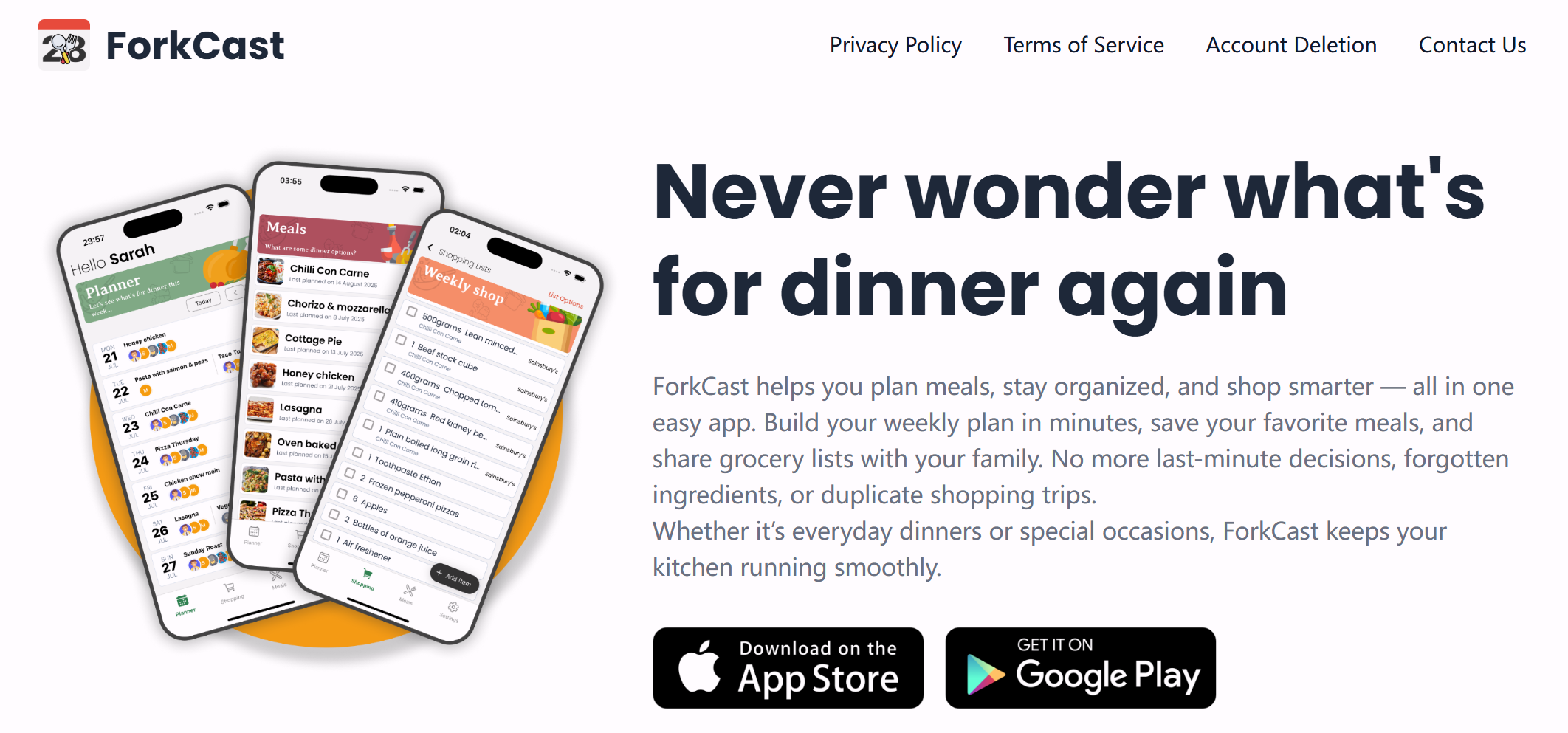 ForkCast是一款膳食计划应用,帮助用户进行周计划、存储食谱、自动生成购物清单,并支持家庭或室友共享访问。