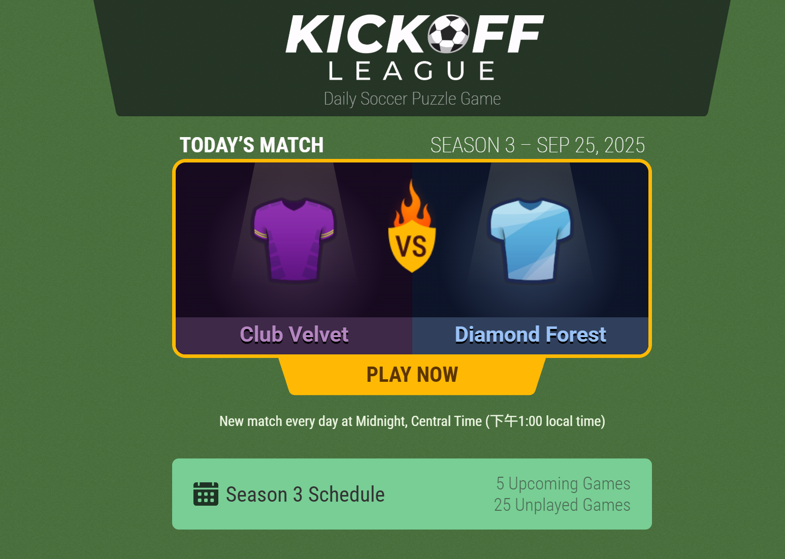 Kickoff League是一款结合了足球和象棋元素的每日谜题Web游戏,通过重现虚构足球联赛中的比赛场景来解谜。