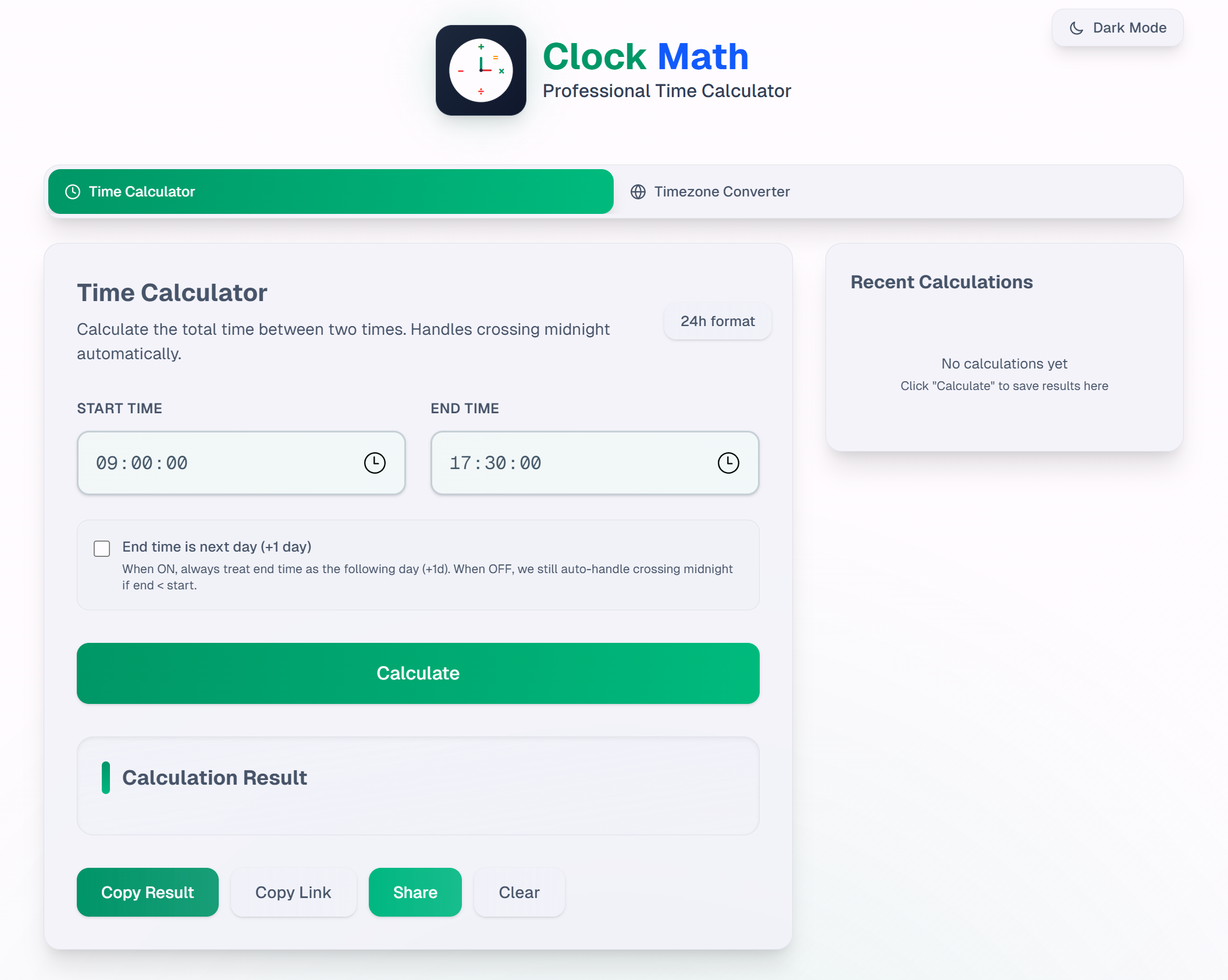 ClockMath是一款简单的时间计算器应用,界面简洁、易用且移动端友好,旨在帮助用户轻松计算时间持续时长。