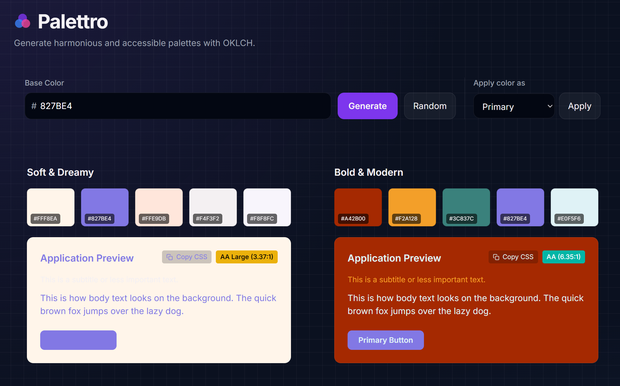 Palettro是一款免费的颜色调色板应用,使用OKLCH色彩空间,内置WCAG对比度检查,能够生成和谐且易于访问的调色板。
