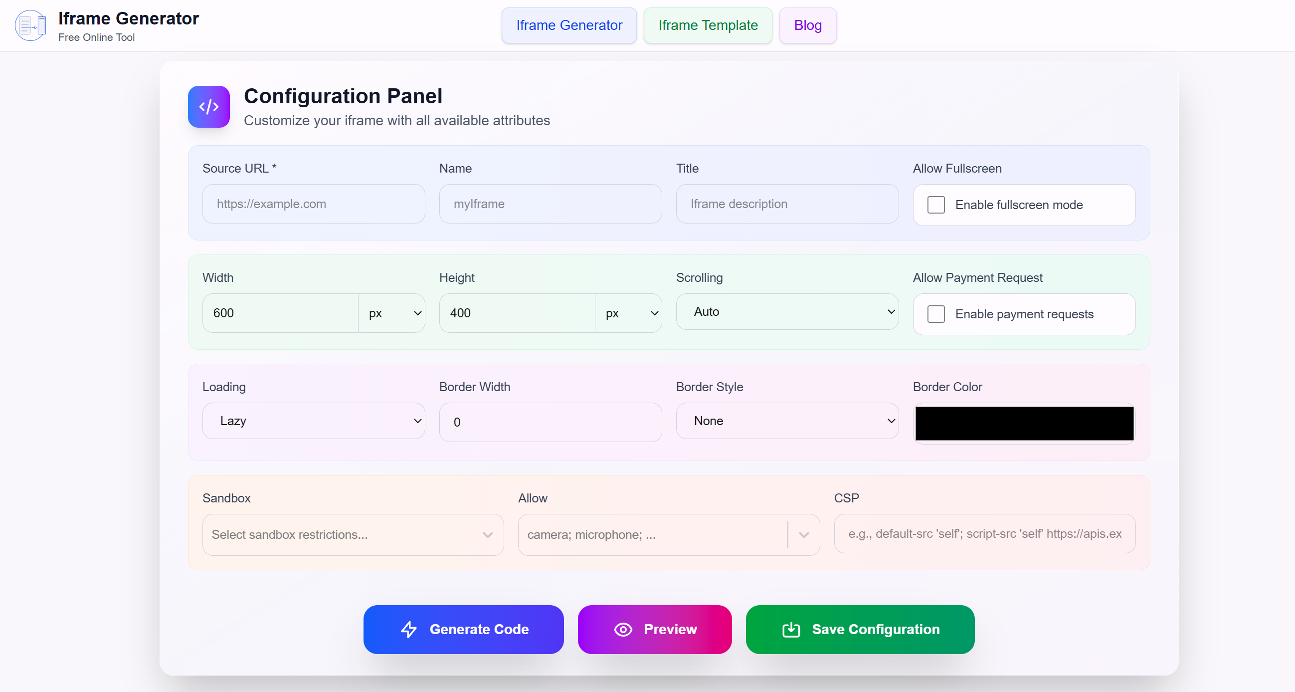 iframe Generator是一款免费在线工具,快速生成含各类属性的iframe代码,支持可视化操作、保存配置和模板功能,适用于嵌入视频、地图和社交媒体等多种场景。