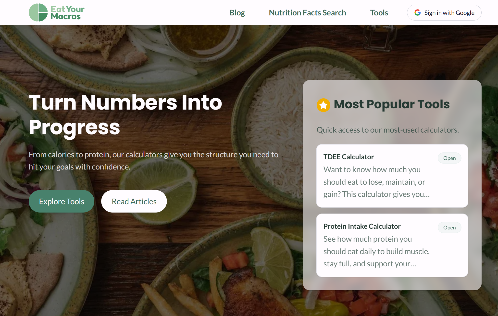 EatYourMacros.com是一个健康计算器网站,提供TDEE、蛋白质和水 intake 计算器。