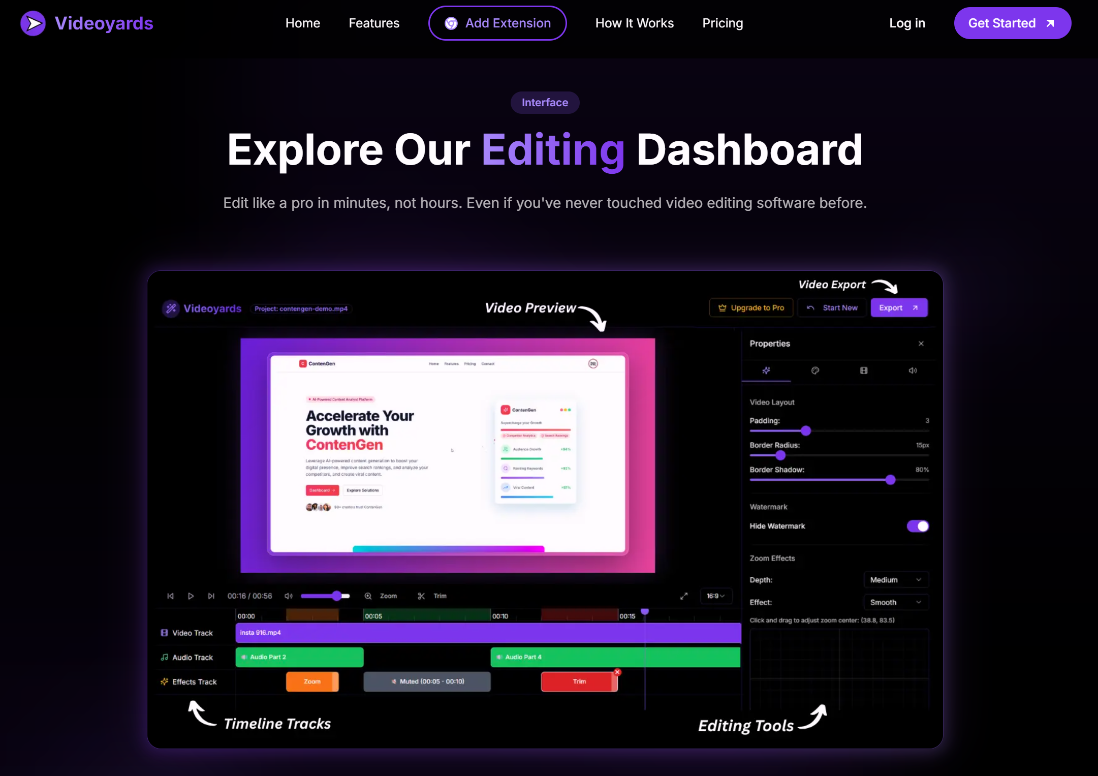 Videoyards是一款跨平台的浏览器应用,支持屏幕录制和视频编辑,提供多种特效和720p、1080p及4K导出选项,且所有操作均在本地进行,确保隐私。