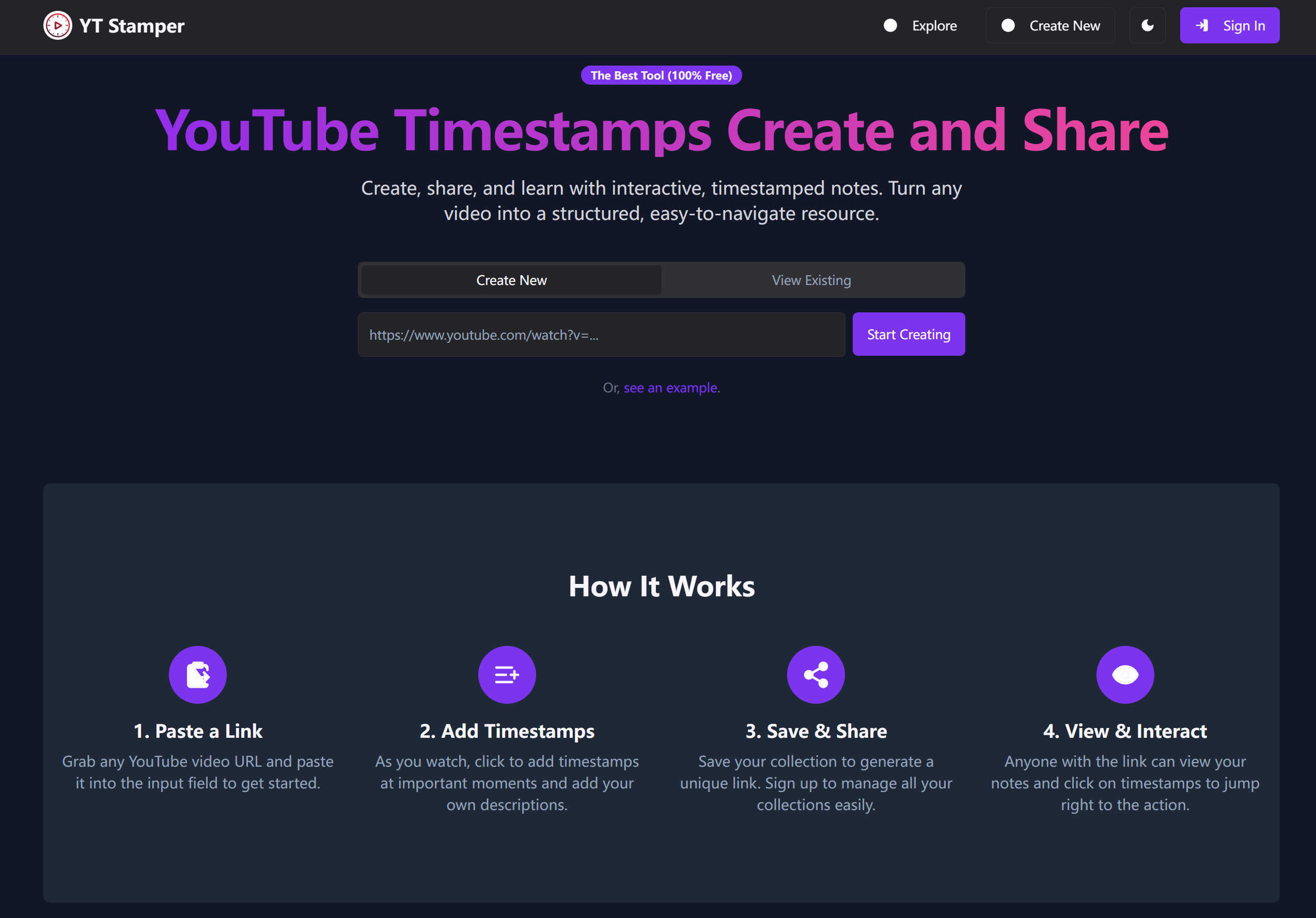 YT Stamper是一款YouTube时间戳应用,允许用户创建带注释的时间戳集合并通过独特链接分享。
