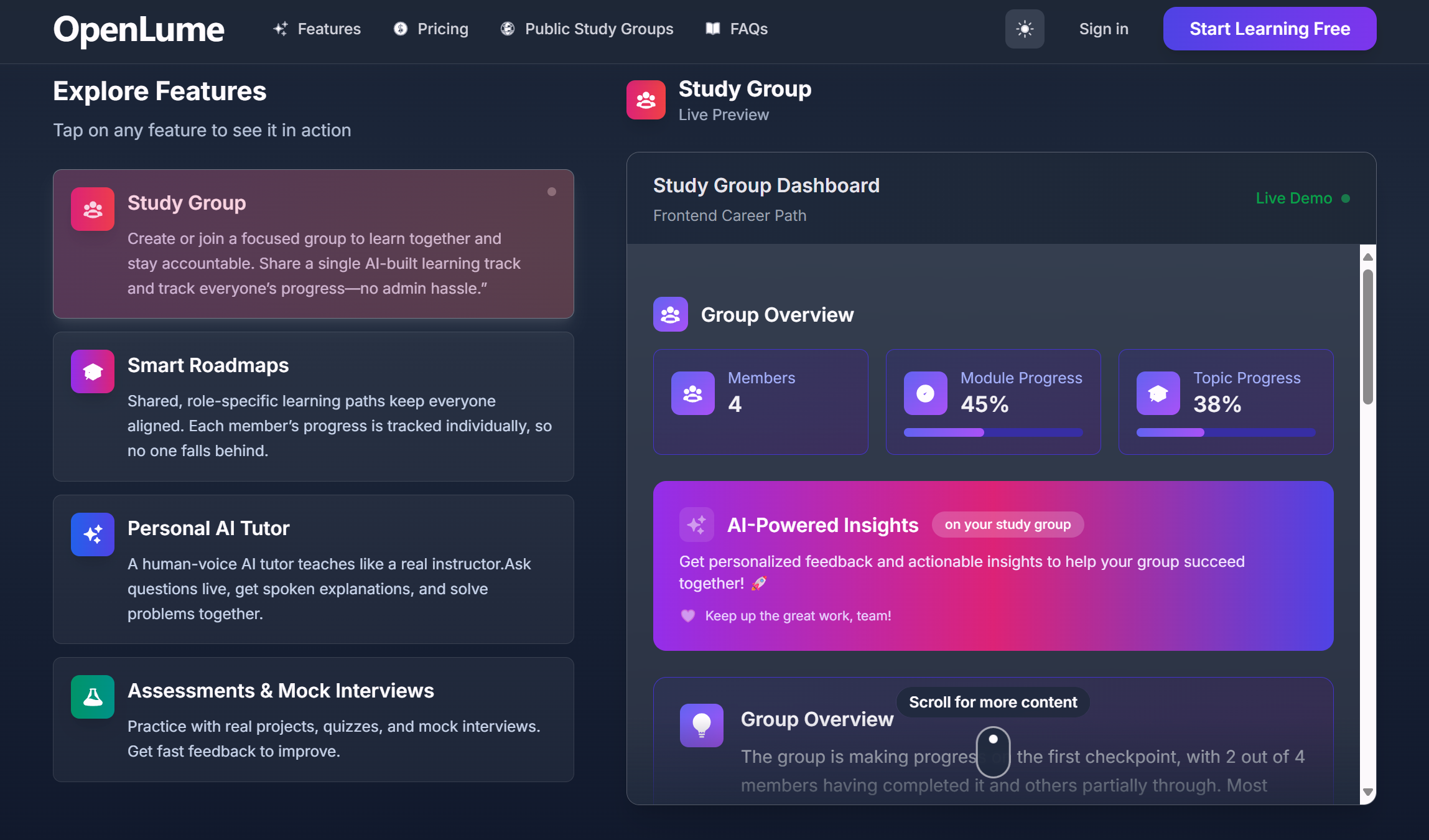 OpenLume是一个AI辅导工具,通过个性化学习路径和项目实践,帮助初级开发者提升实际工作能力。