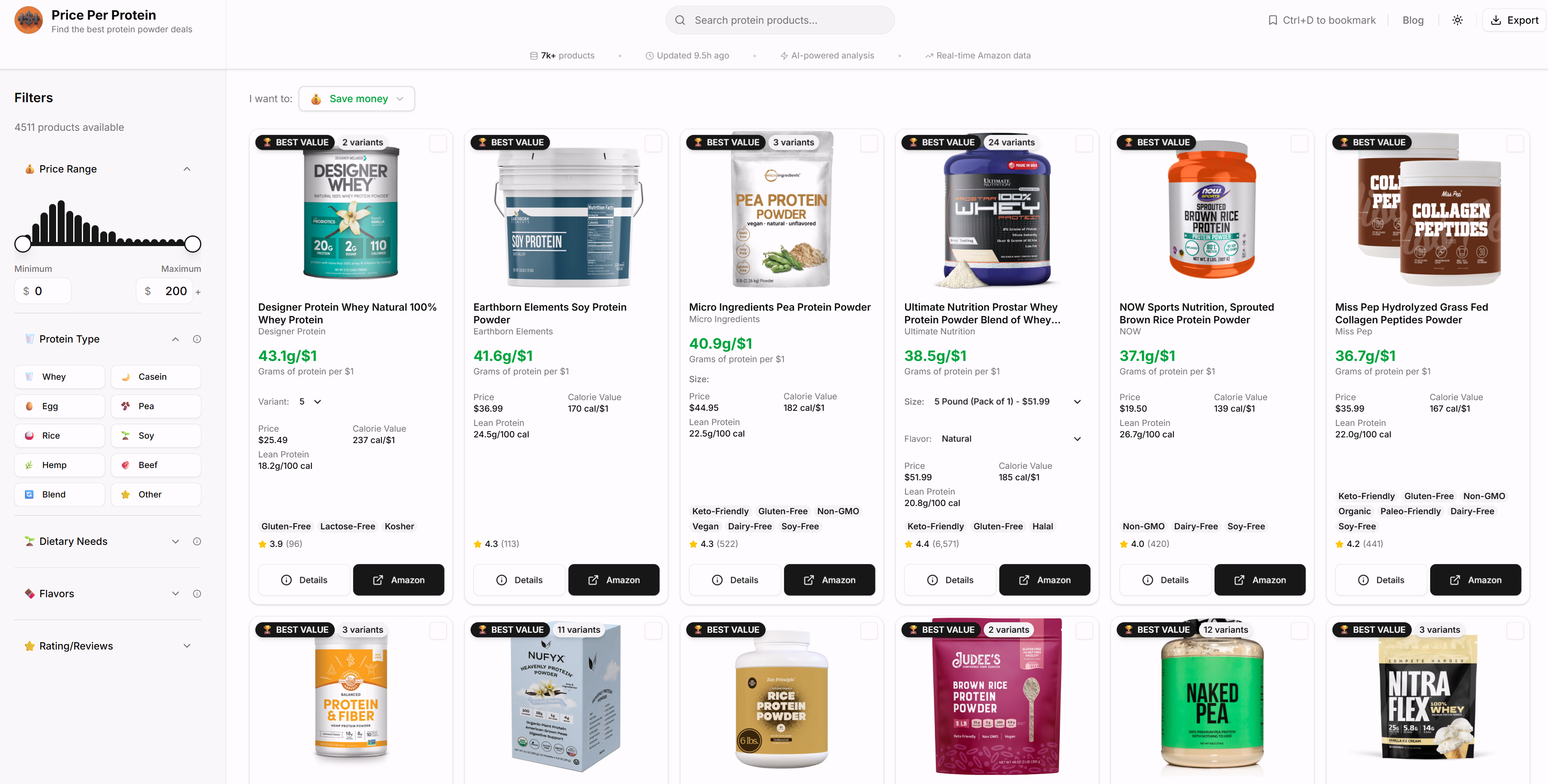 PricePerProtein是一款分析蛋白质粉价格的网站,帮助用户找到每克蛋白质最便宜的产品,支持实时更新。