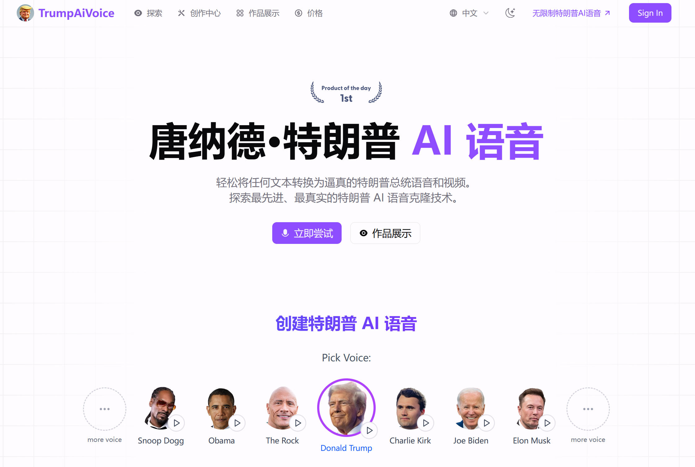 Trump AI Voice是一款AI语音应用,用户可以通过输入文字生成拟真的名人语音,支持4K视频和AI歌曲MV创作,旨在降低创作门槛。