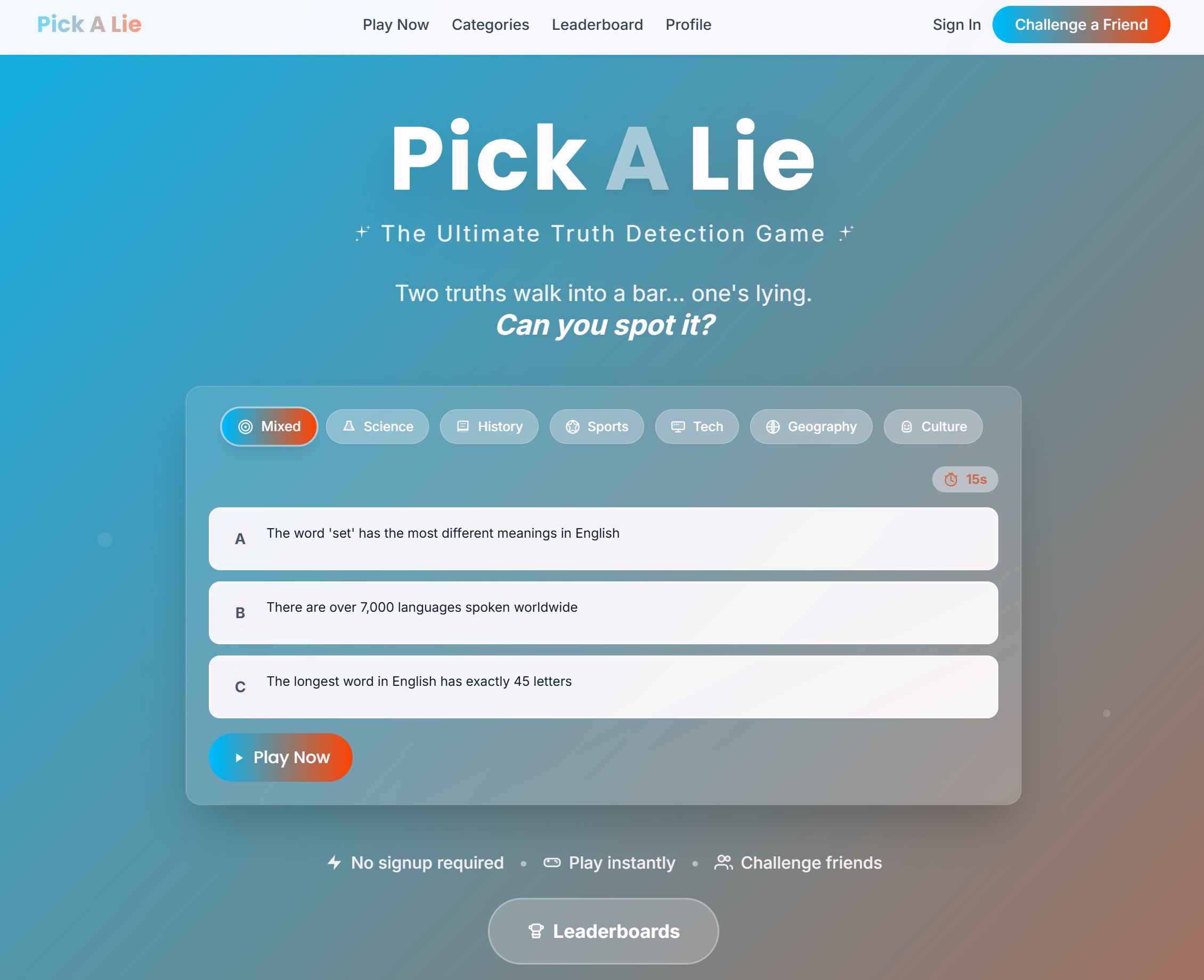 PickALie是一款在线游戏,用户通过猜测哪个陈述是假的来得分,并参与排行榜竞争。