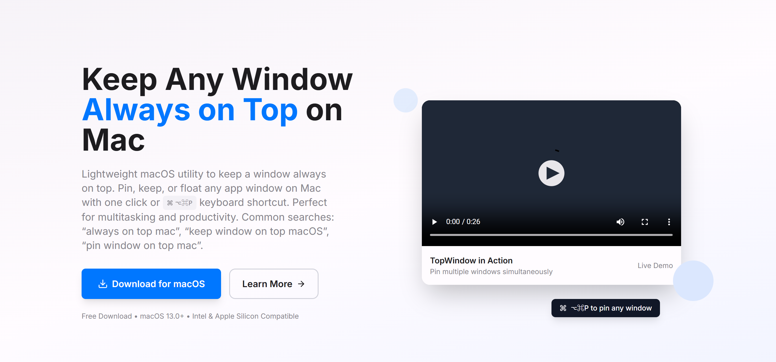 TopWindow是一款用于在 MacOS 系统中实现窗口置顶功能的应用。