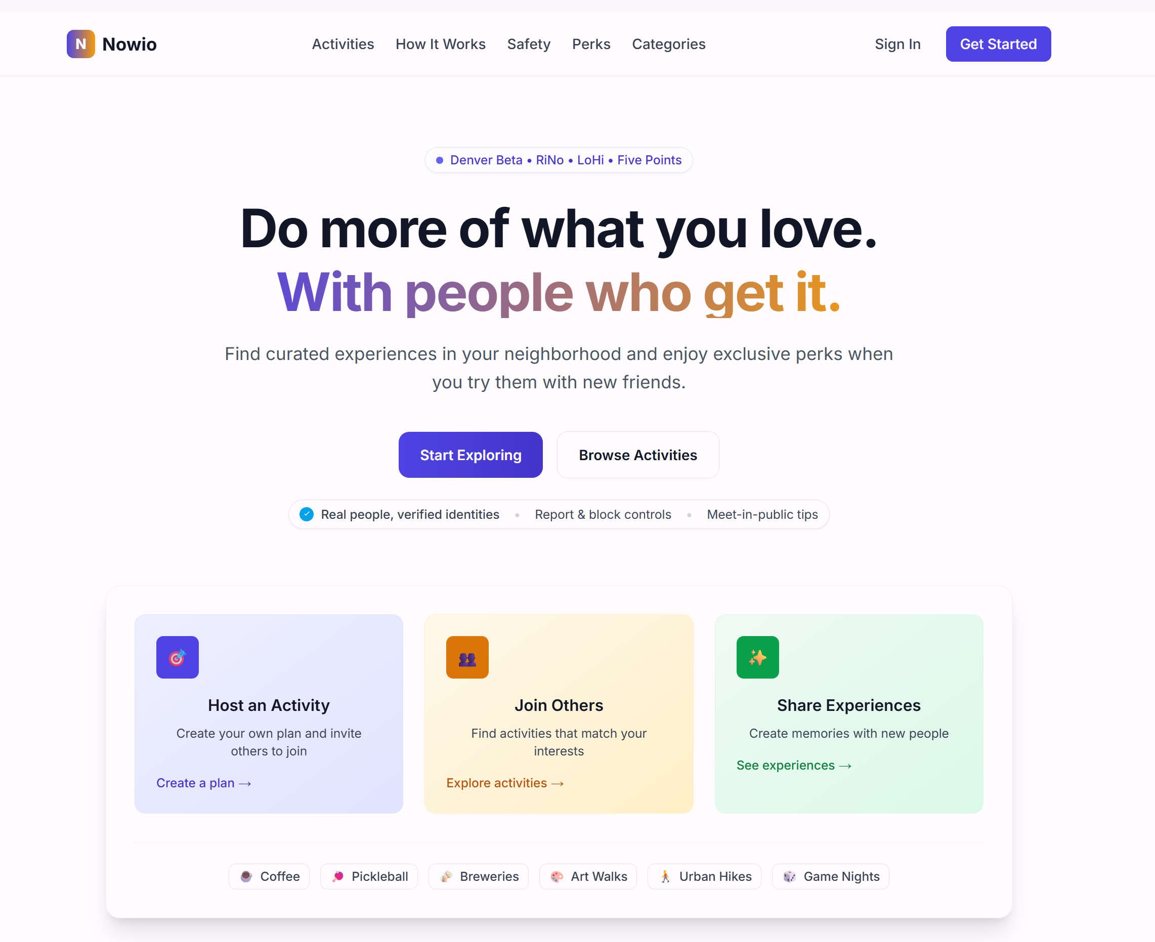 Nowio是一款社交应用,通过身份验证和隐私保护,帮助用户线下见面并参与活动,解决社交孤独问题。