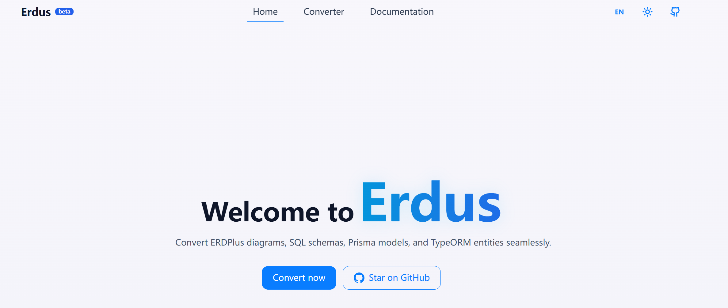 Erdus是一款开源ER图转换工具,支持ERDPlus、SQL、Prisma和TypeORM等格式的无缝转换,并提供浏览器端操作和轻量级CLI功能。