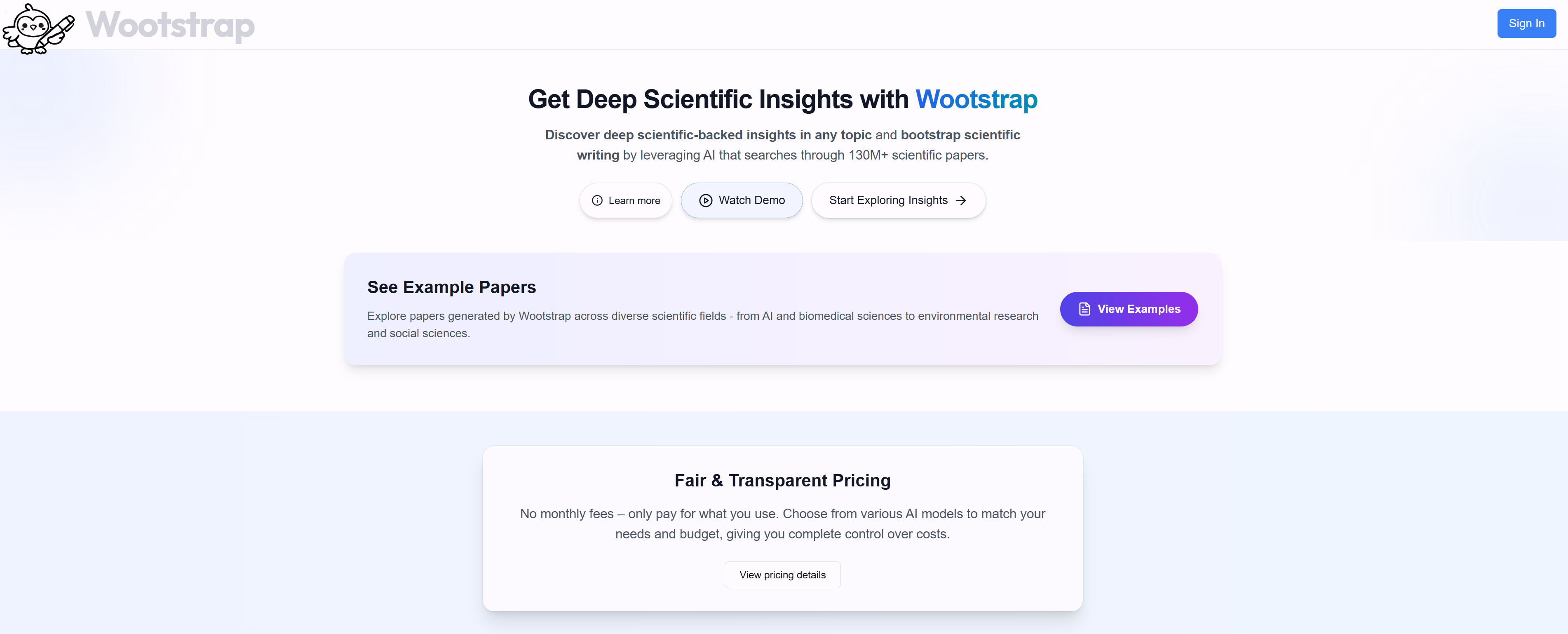 Wootstrap是一款AI写作助手,简化科学文献综述和研究论文的写作,提供基于真实研究的文献综述或草稿,避免虚假引用。