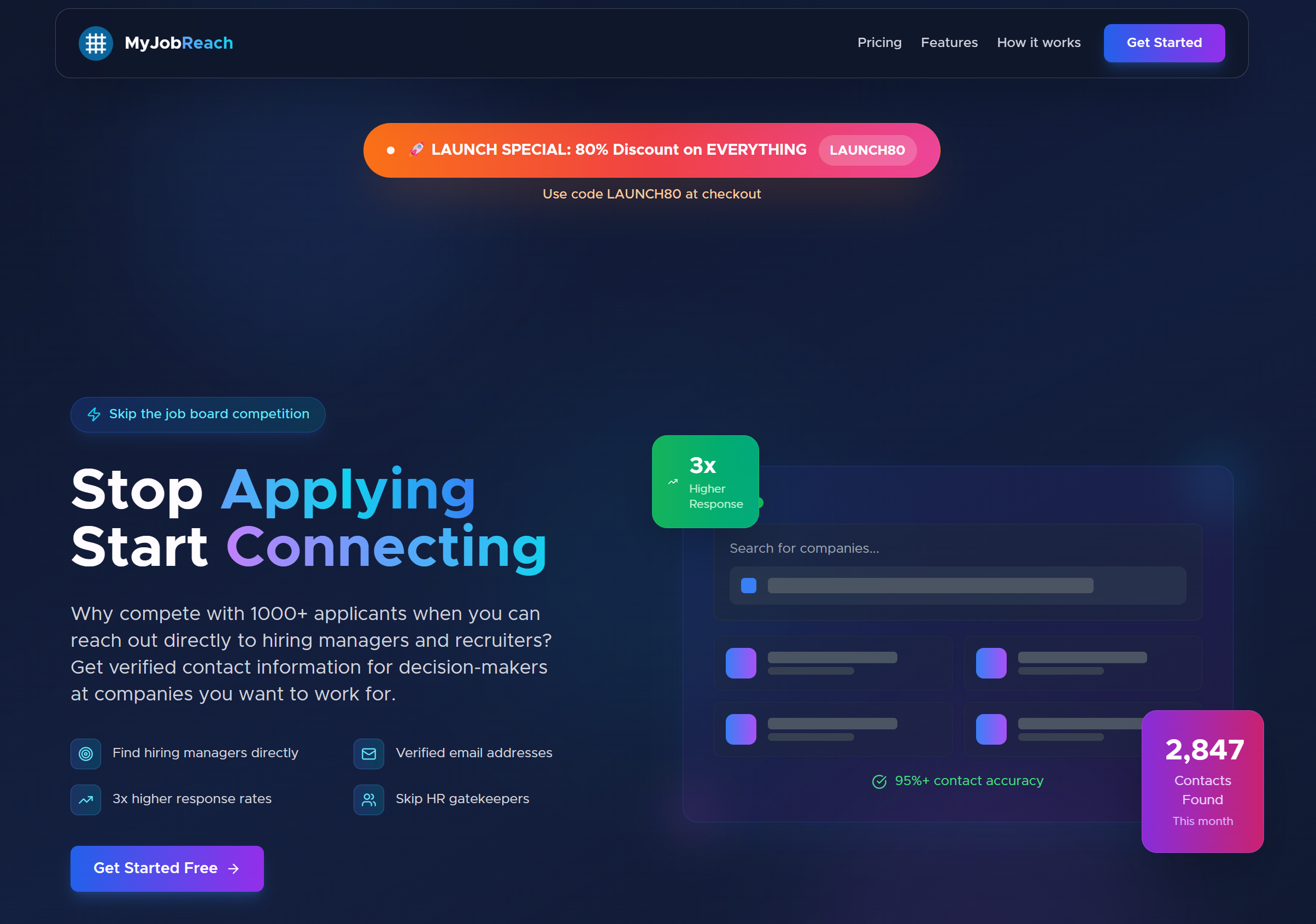 MyJobReach是一款求职平台,允许用户直接搜索招聘人员并获取联系方式,方便求职者通过邮件或LinkedIn直接联系雇主。