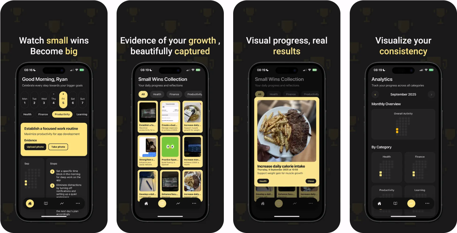 Small wins是一款iOS应用,帮助用户记录和鼓励小成就,旨在通过小步骤逐步掌控生活,改善负面情绪。