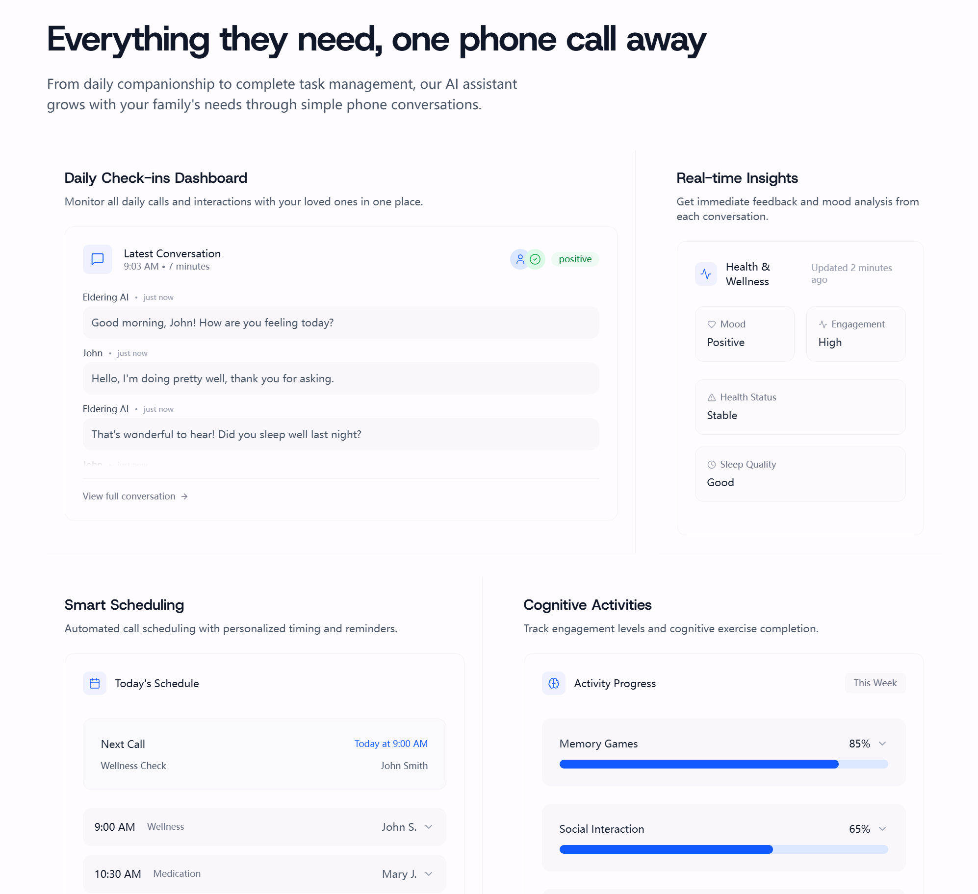 Eldering是一款帮助家庭与年迈父母保持联系的电话应用,通过友好的对话、脑力游戏和提醒,向成年子女发送简短的总结,增强家庭的连接感。
