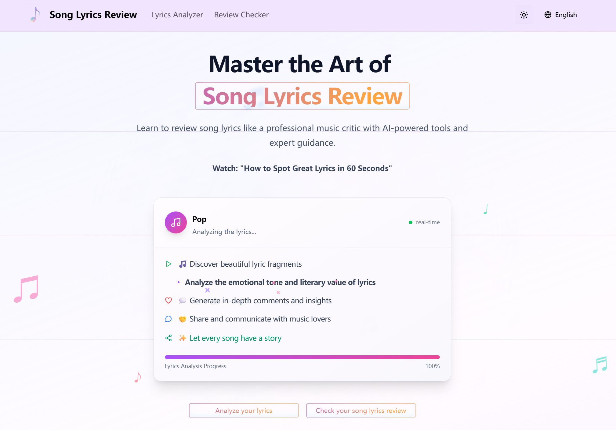 Song Lyrics Review是一款AI辅助的歌词评价软件,提供AI歌词评价生成和审阅功能,帮助歌词创作者获取灵感和改进歌词。