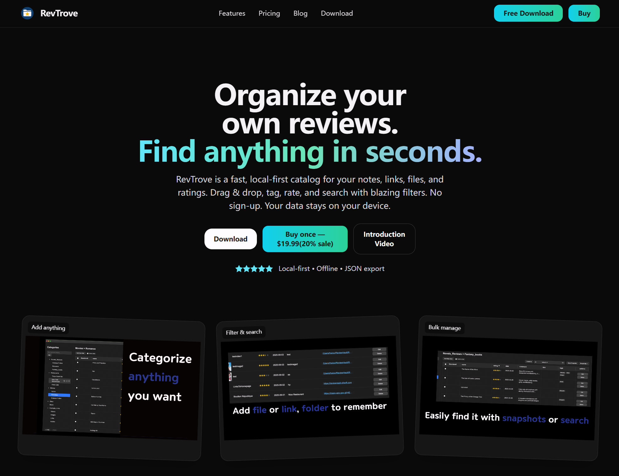 ReviewVault是一款本地优先的评论管理应用,支持离线使用、数据以JSON格式存储,并提供便捷的组织和搜索功能,适合记录和管理各种个人评论。