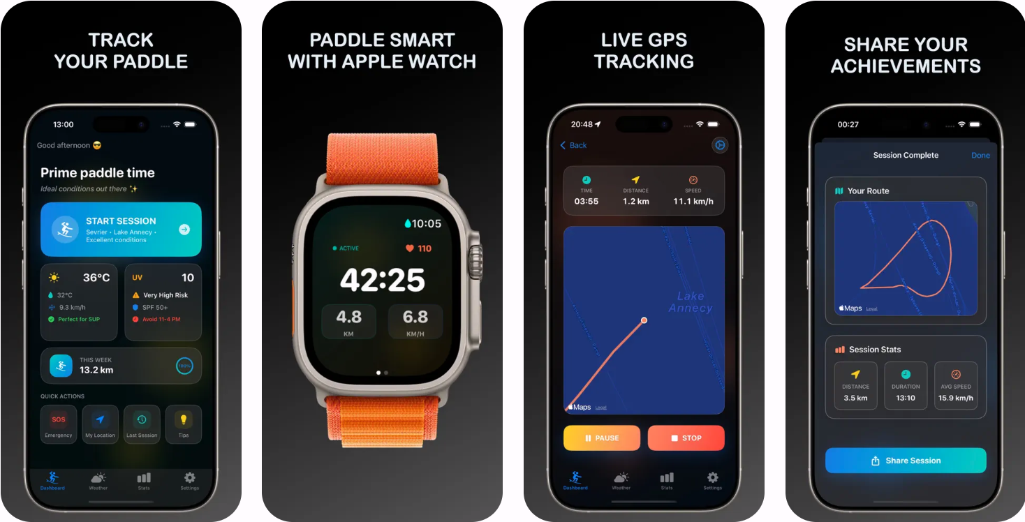 Paddle Track是一款记录桨板运动数据的应用,支持Apple Watch实时显示速度、距离和卡路里。