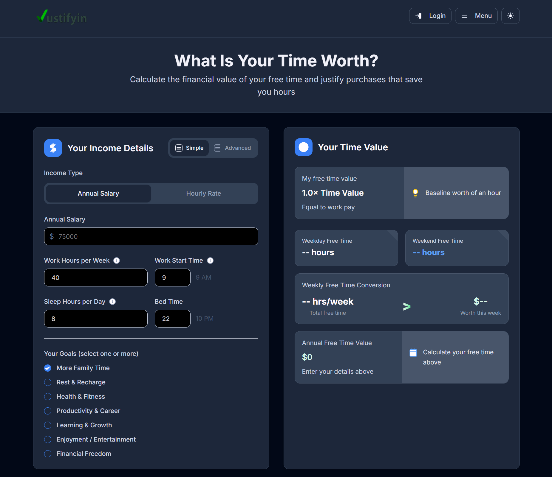 Justifyin是一款web应用,通过比较时间价值与金钱,帮助用户评估购买、订阅或副业的划算性,并提供个人化的时间安排和目标设置。