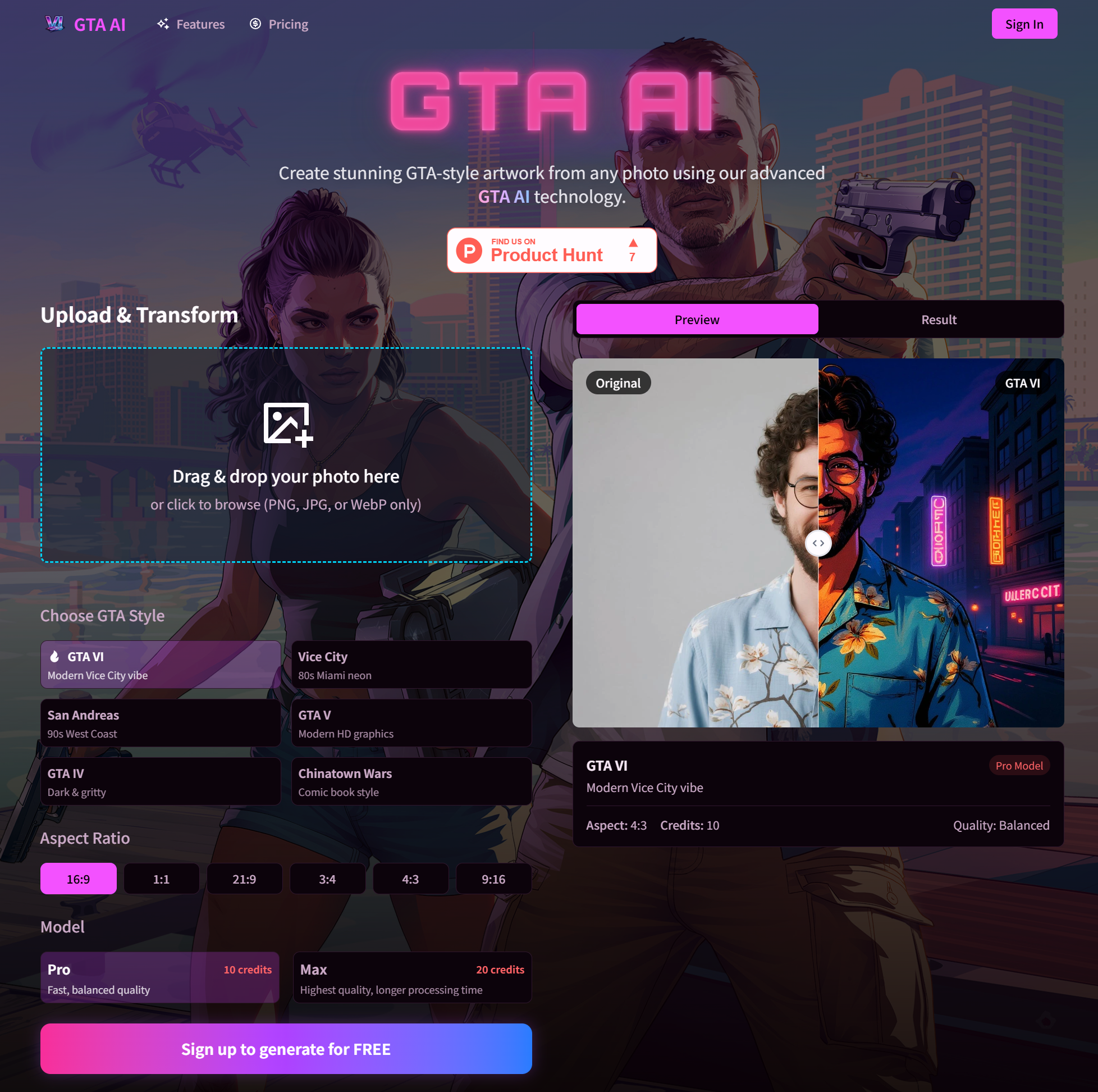 GTA AI是一款头像生成工具,提供6种GTA风格选择,支持1:1比例头像生成。