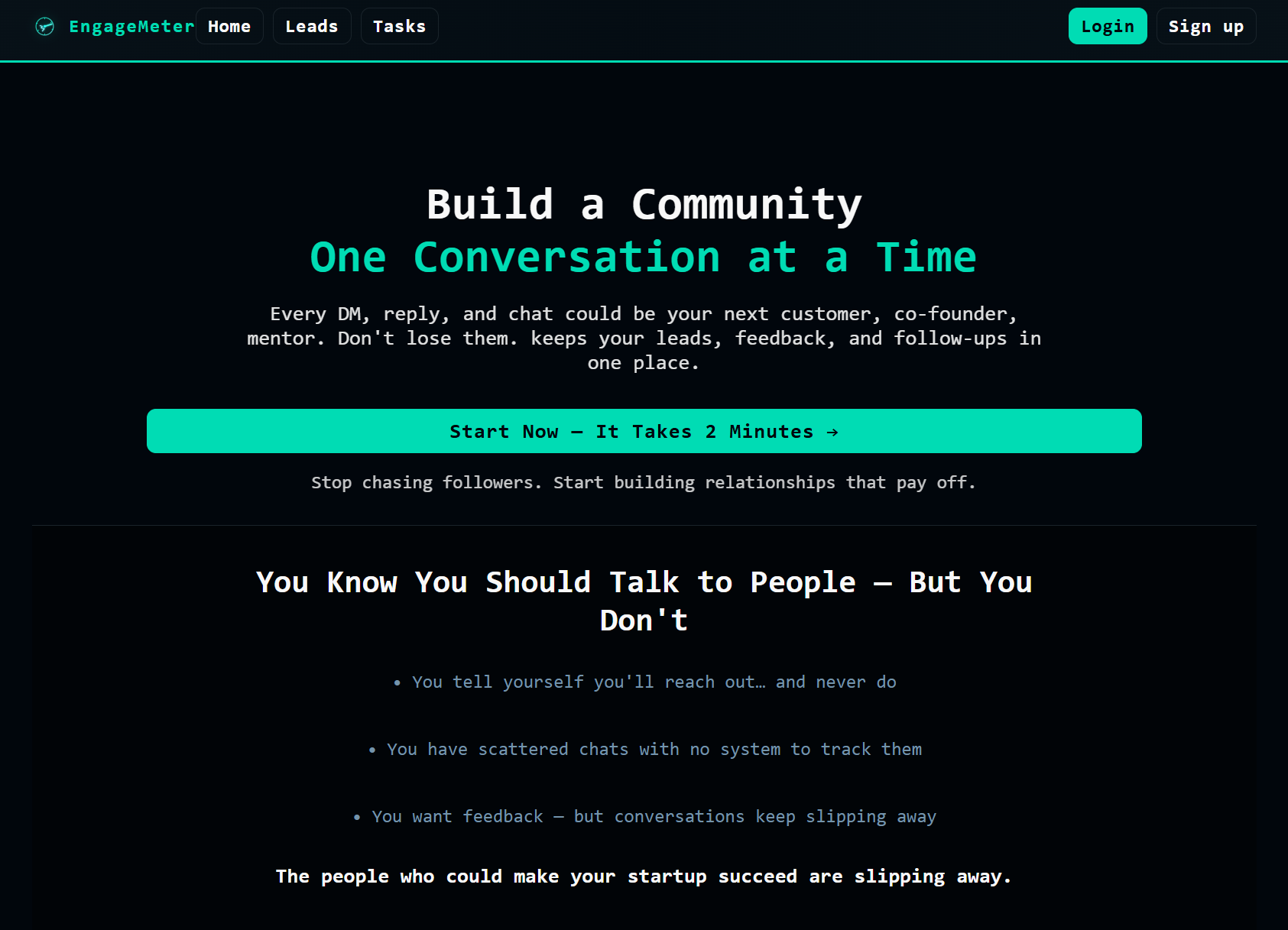 Engagemeter是一款用于跟踪与潜在客户对话和任务的简单工具,帮助用户记录对话内容并及时跟进。