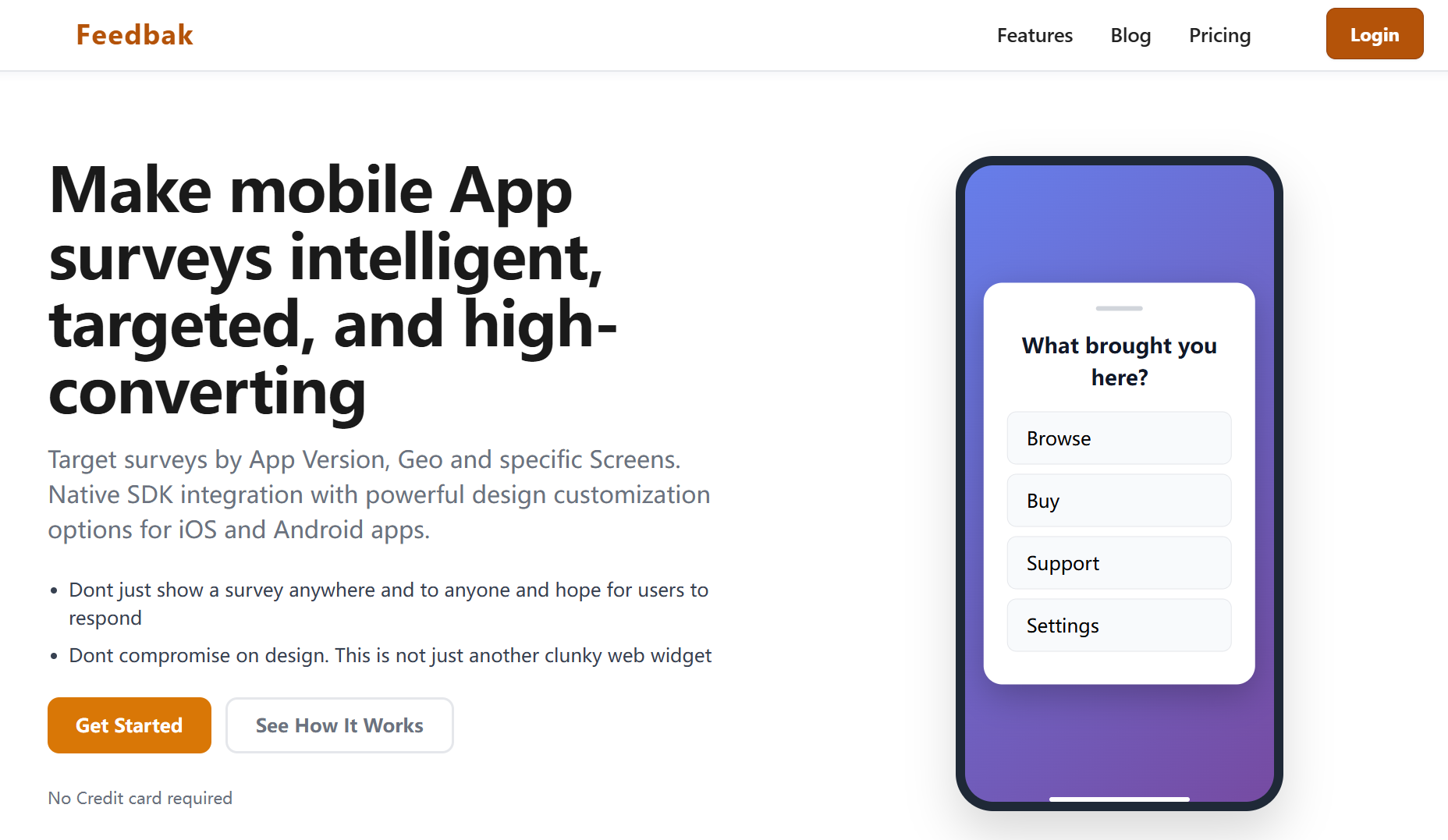Feedbak是一款应用内调查工具,使用原生组件捕获用户对App的整体情感,提供CSAT和NPS指标,支持文本问题,且无需App更新即可更改问题。