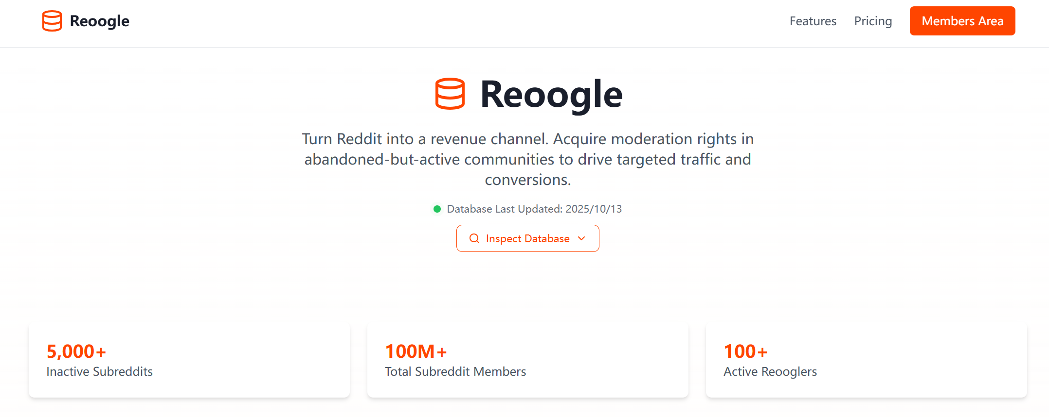 Reoogle是一款自增长数据库应用,包含可以认领和管理的没有活跃版主的subreddit,目标用户为市场营销/SEO专家和创业公司创始人。