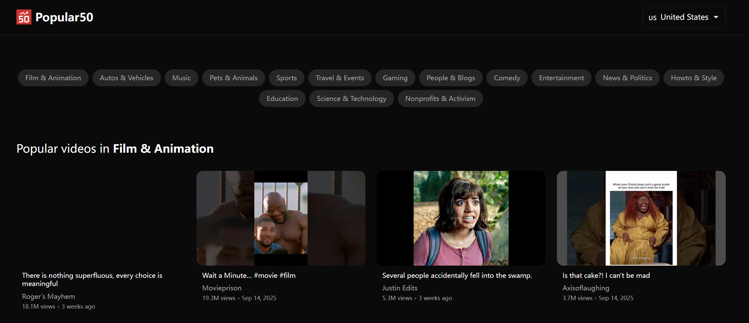 Popular50是一款YouTube热门视频浏览工具,按国家和类别展示前50个视频和短片,无需登录和广告,支持嵌入式播放器观看。