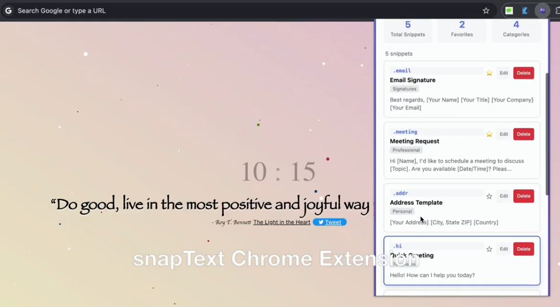 SnapText是一款Chrome文本扩展工具,速度快、完全免费且保护隐私,允许用户通过快捷方式快速扩展文本,适用于需要频繁输入相同内容的用户。