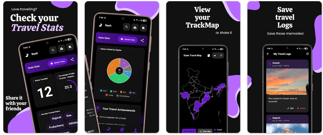 Raah是一款旅行追踪应用,可以标记地点、查看统计数据和排行榜等功能。