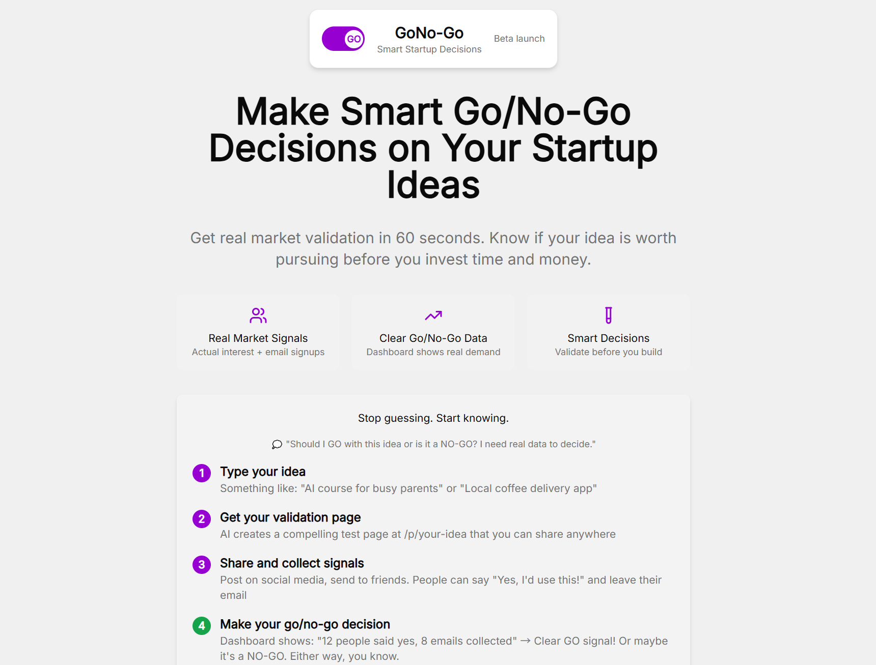 Gono-go是一款创业想法验证工具,用户可以在60秒内通过AI生成验证页面并收集反馈,从而决定是否继续推进项目。