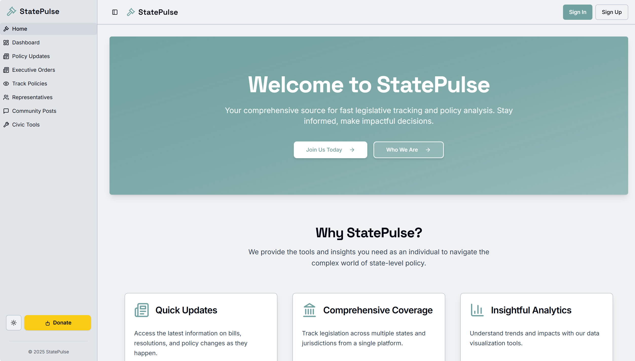 StatePulse是一款免费开源平台,每日更新并抓取各辖区最新立法,使用Gemini API总结法案,提供议员投票信息,帮助用户了解立法动态。