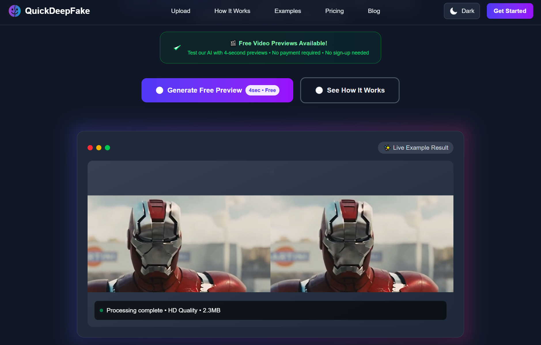quickdeepfake是一款快速生成deepfake视频的SaaS工具,适合用于娱乐和轻量级营销内容。