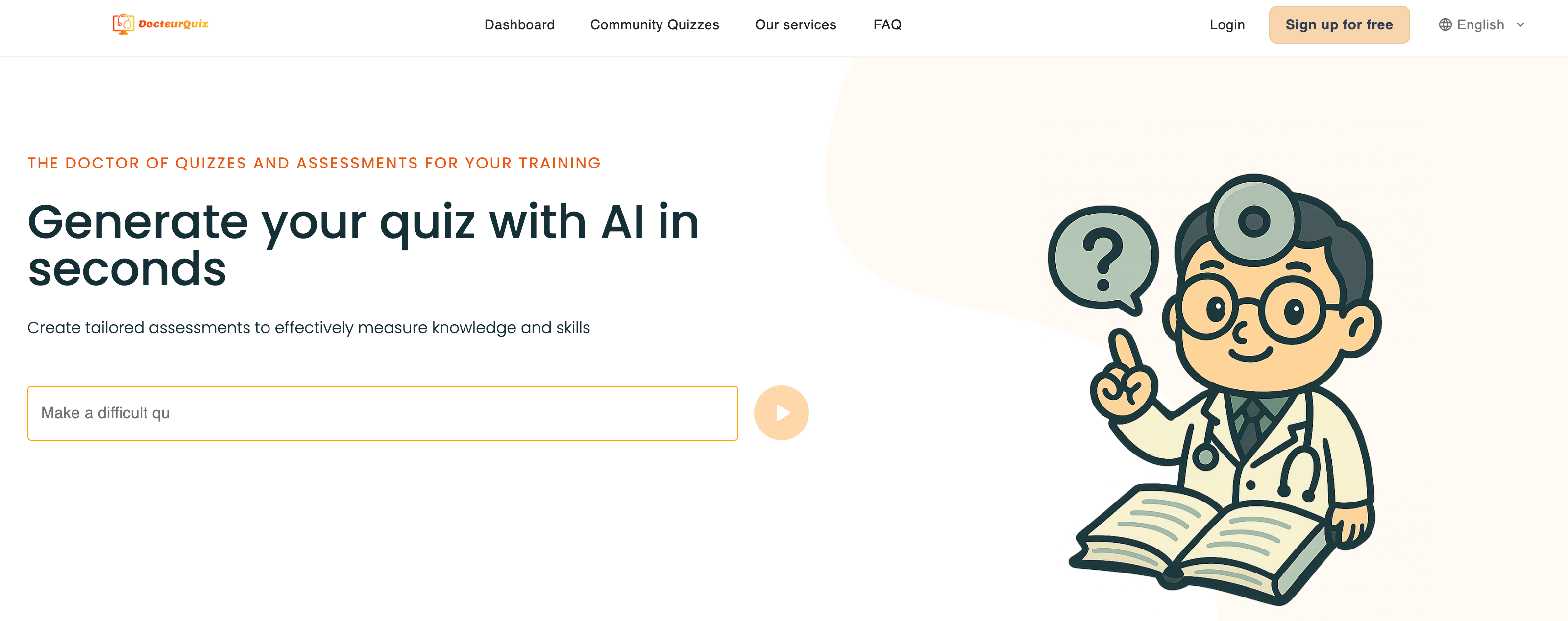 DocteurQuiz是一款AI驱动的测验平台,能够生成互动测验、实时跟踪分析学习进度,并提供完全定制化选项,旨在帮助教育者节省时间并提升学习体验。