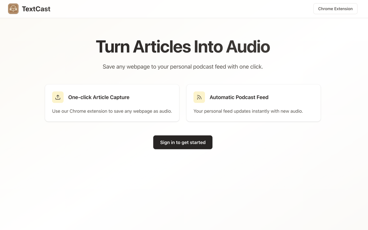 TextCast是一款Chrome扩展程序,将文章转换为播客,通过文本清理和TTS技术生成音频,方便用户在通勤等场景下收听。