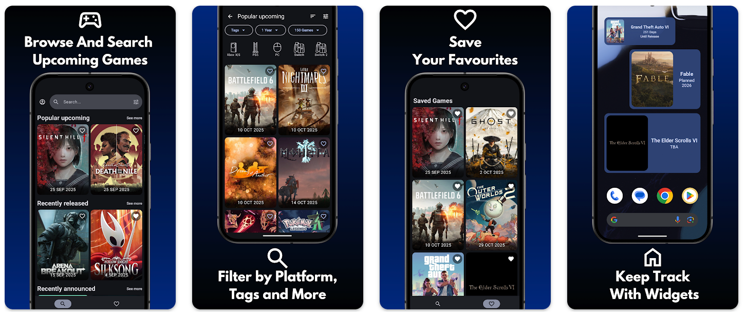 Game Release Tracker是一款安卓应用,允许用户浏览即将发布的游戏,并提供筛选、排序、倒计时小部件和发布通知功能。