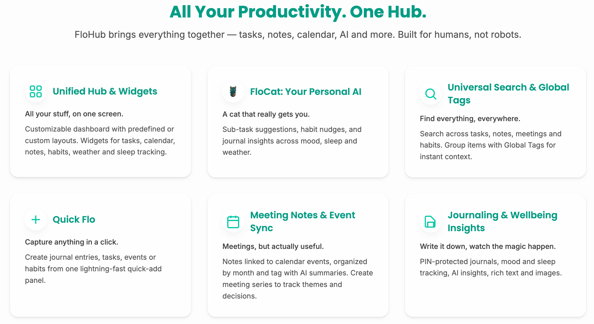 FloHub是一款个人效率工具,集成日历、笔记、任务管理、习惯追踪和AI洞察,旨在解决用户在多平台管理信息的困扰。