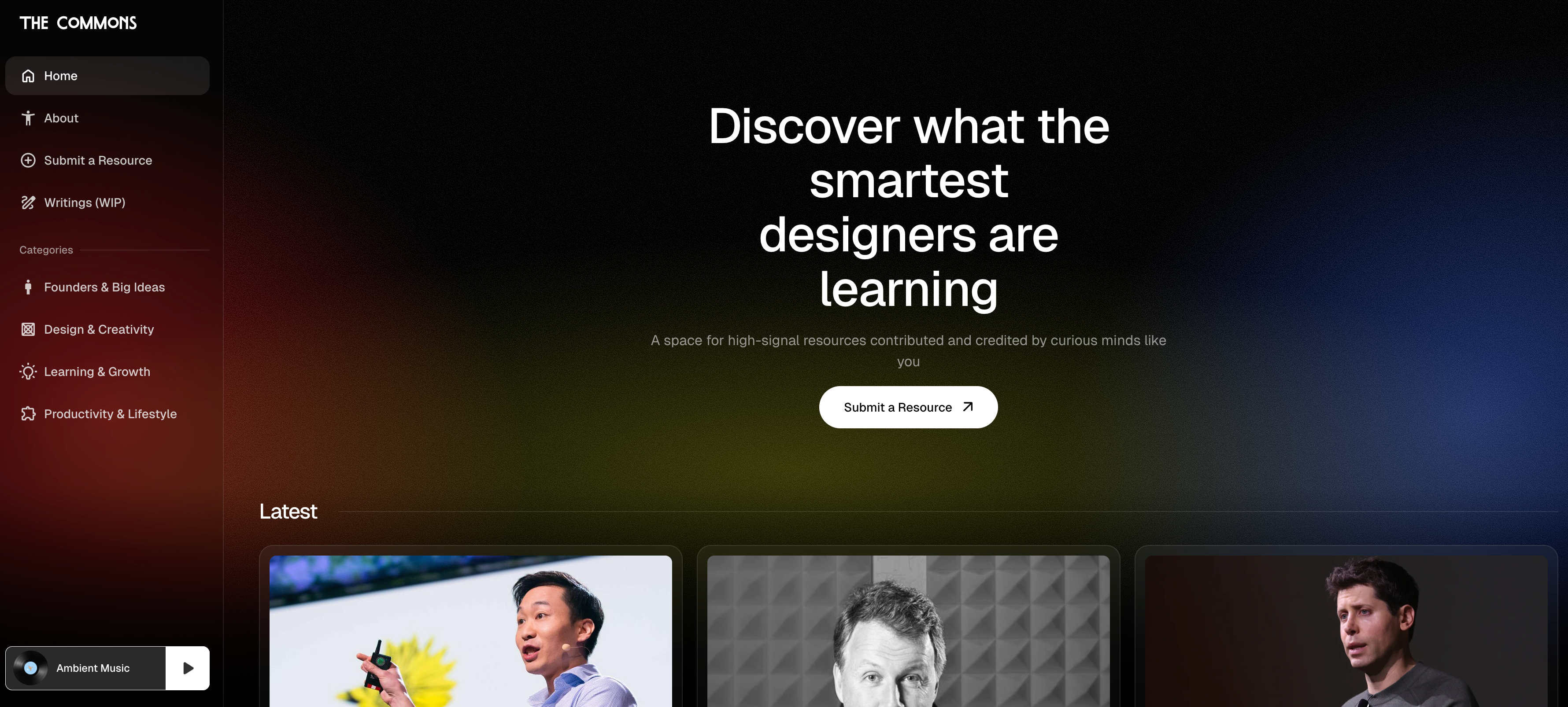 The Commons是一款免费资源分享平台,用户可以分享改变思维的文章、播客、视频、工具和想法,并附带个人信息和LinkedIn链接。