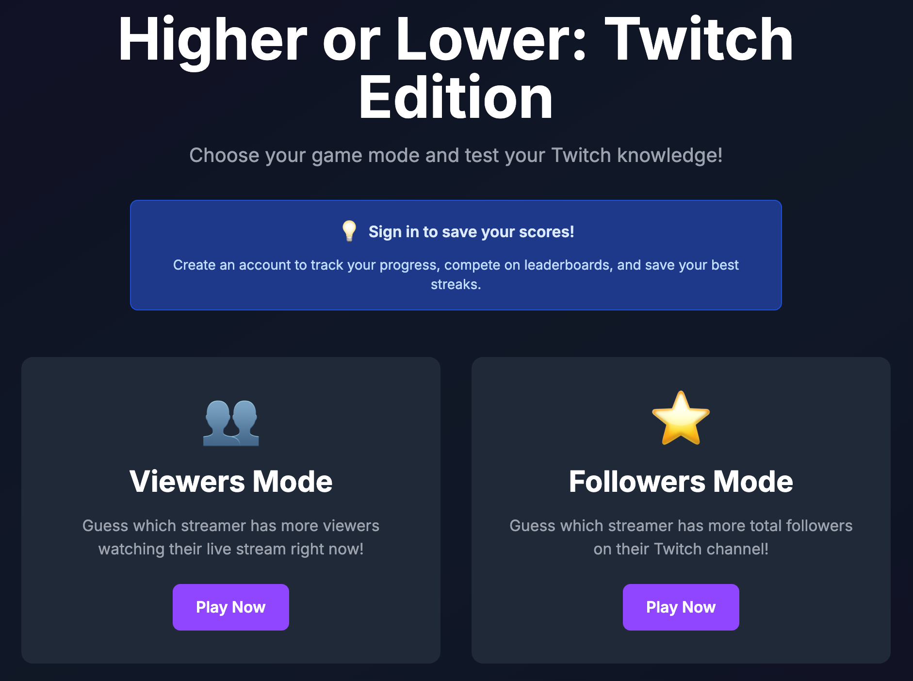 Higher or Lower: Twitch Edition是一款实时数据猜测游戏,玩家选择两个Twitch主播并猜测哪个主播的观看人数更多,简单有趣,适合Twitch爱好者。